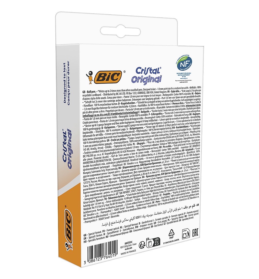 L'entrepreneur français Marcel Bich a initié une révolution en 1950 avec le stylo bille BIC Cristal Original, à l'écriture fluide et sans bavure. Il dévoile un trio imbattable : une pointe, une bille parfaitement sphérique et une encre de haute qualité fabriquée dans les usines BIC. Depuis, l'entreprise a maintenu ses standards de qualité irréprochables en optimisant le stylo BIC Cristal en continu. Au fil des années, le stylo s'est progressivement allégé et l'encre brevetée continue d'être perfectionnée pour offrir une écriture toujours plus douce. Ils durent deux fois plus longtemps que les stylos à bille les plus connus. Objet omniprésent, connu et aimé de tous depuis des décennies, le stylo à bille BIC Cristal fait partie intégrante de la vie quotidienne de millions de personnes dans le monde, qu'il s'agisse d'étudiants, professionnels ou artistes. Cet objet iconique est même exposé au Musée d'Art Moderne de New York (MoMA) et au Musée d'Art Moderne/Centre Pompidou à Paris, où les visiteurs s'émerveillent toujours de son design intemporel. De plus, son emballage est en carton 100 % recyclable. Parce que seul BIC peut égaler BIC.
