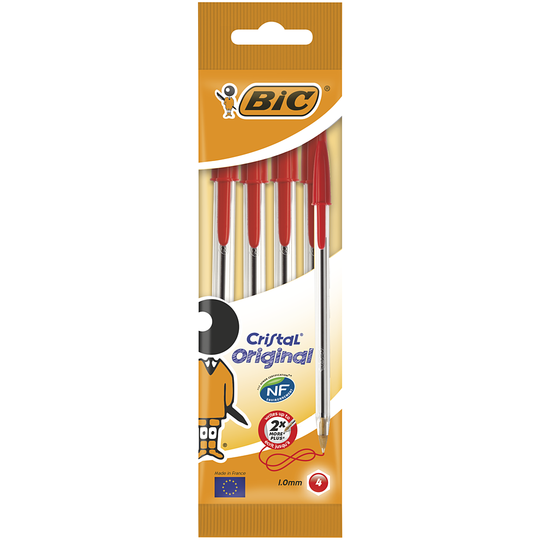 Le BIC Cristal Original est le stylo-bille emblématique le plus vendu au monde. Recevez 4 stylos qui écrivent nettement et confortablement en rouge. Légers et capables d'écrire en moyenne 3 km de long, ces stylos, fabriqués en France, sont certifiés NF Environnement. Objets iconiques, leur design épuré leur a permis d'entrer dans les collections permanentes du Museum of Modern Art de New-York (MoMA) et du Musée d'Art Moderne/Centre Georges Pompidou à Paris.