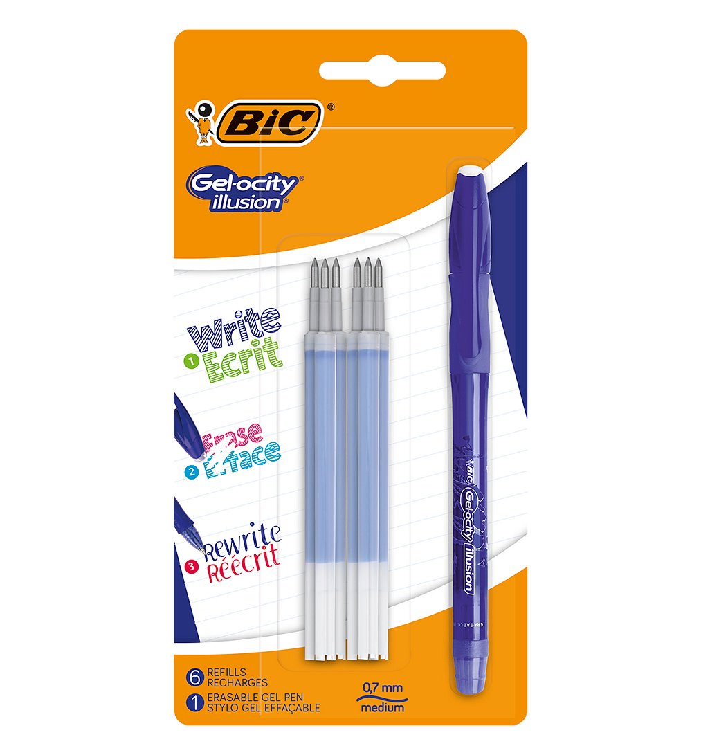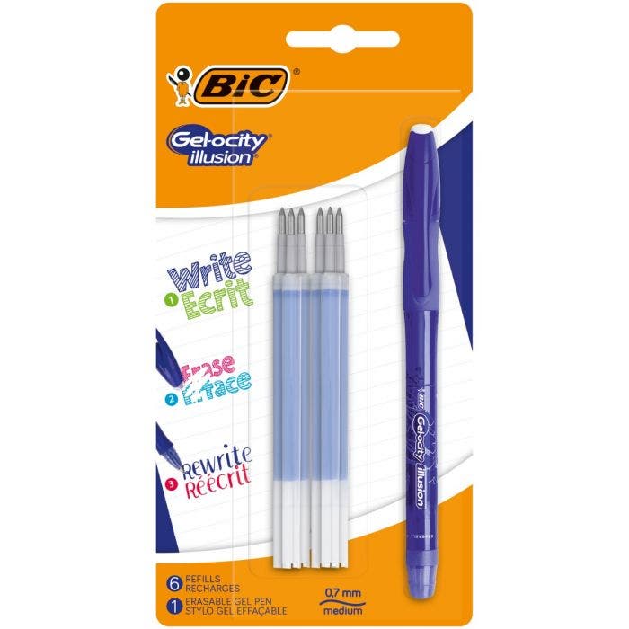 BIC Gel-ocity Illusion Stylo Gel Effaçable Pointe Moyenne (0,7 mm) - Bleu, Blister de 1 + 6 Recharges BIC