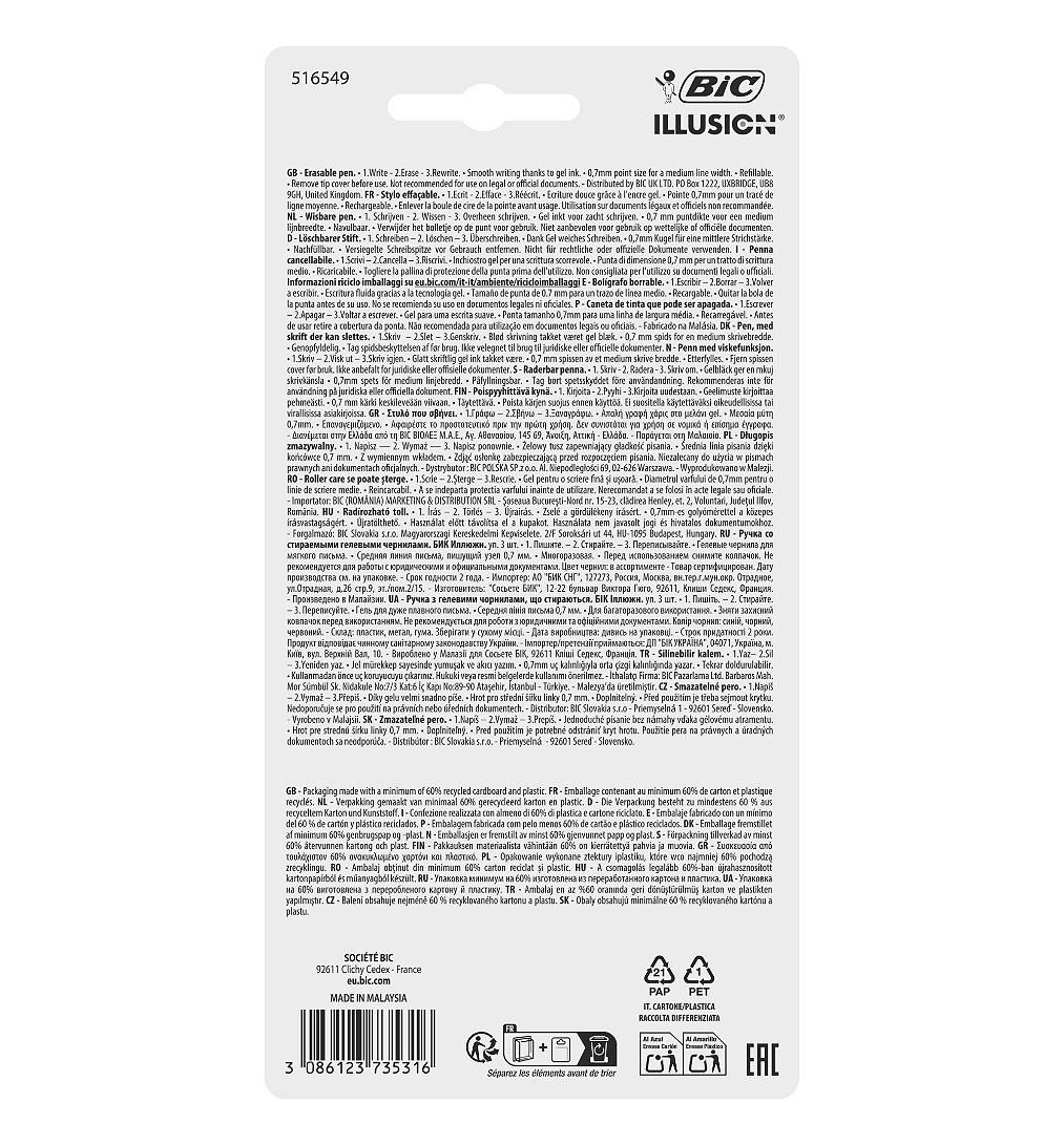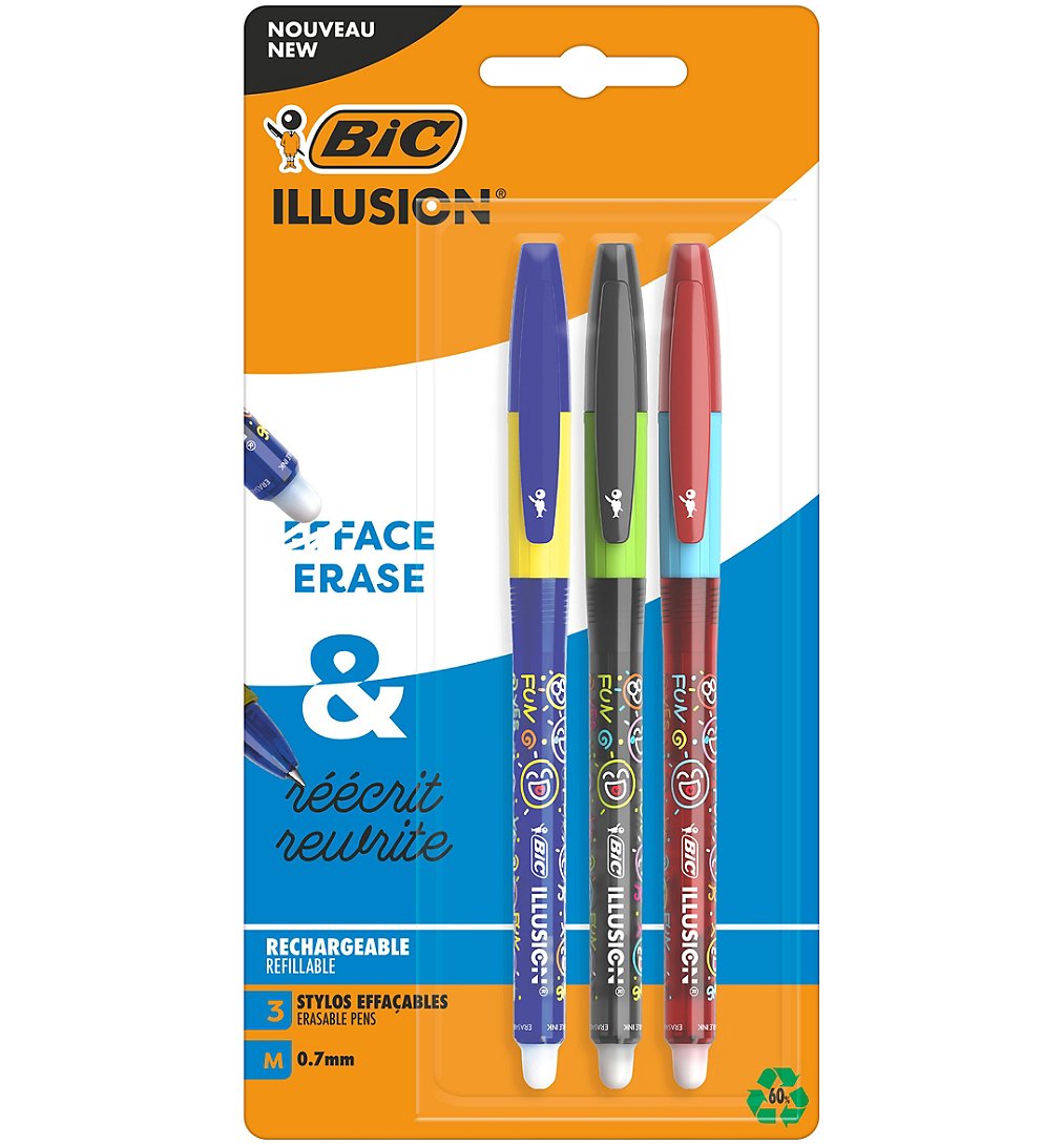 | Libellé | BIC Illusion Stylo Gel Effaçable Pointe Moyenne (0,7 mm) - Blister de 3 |