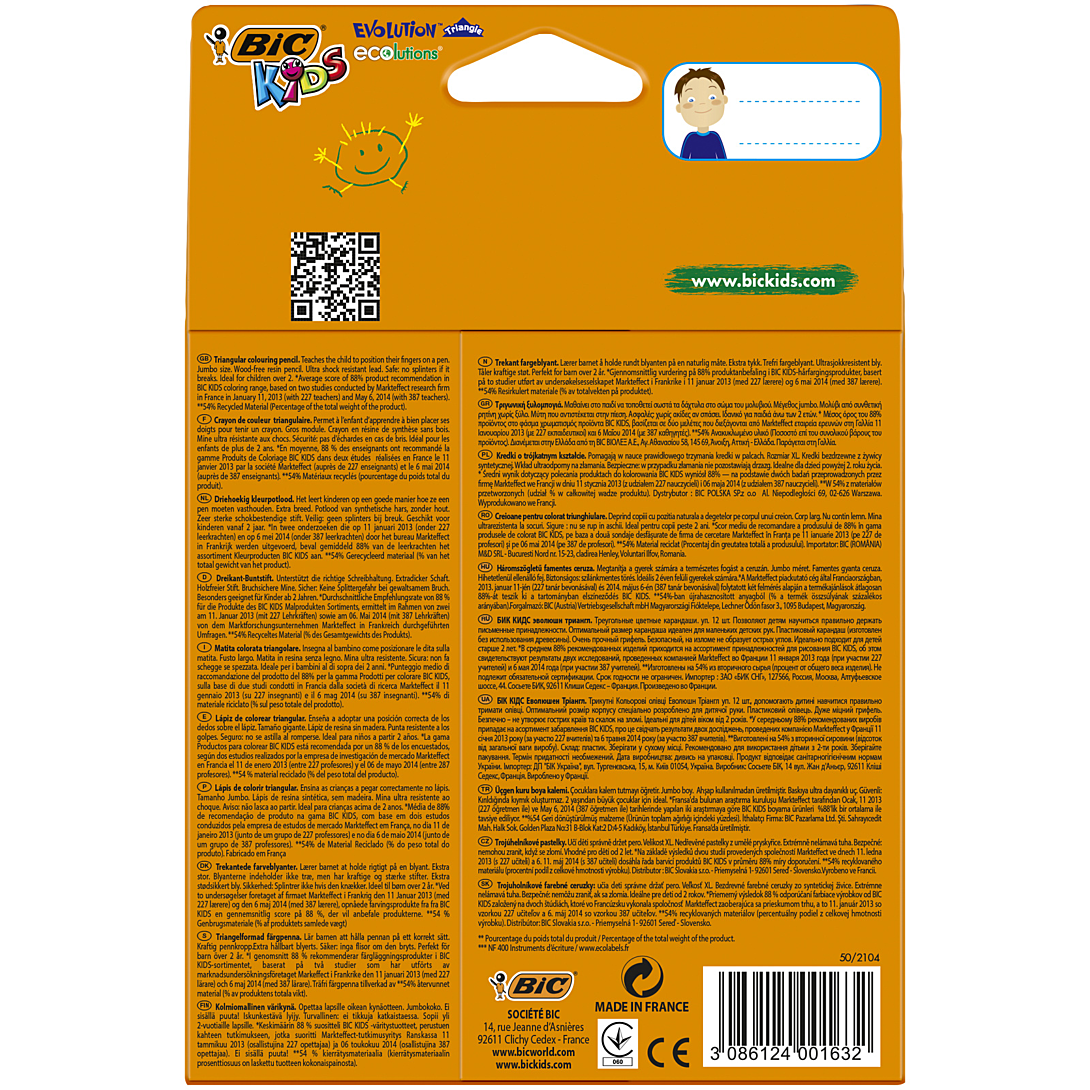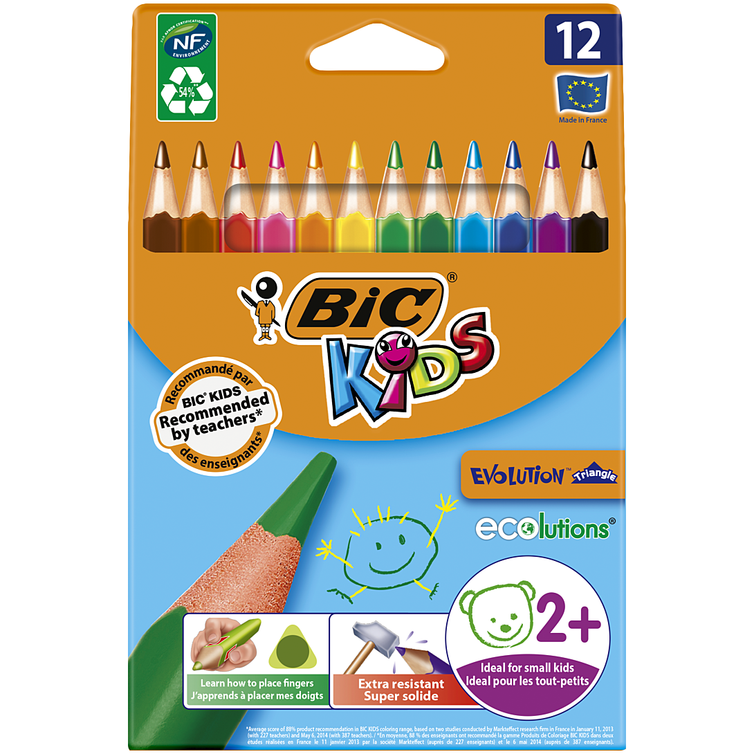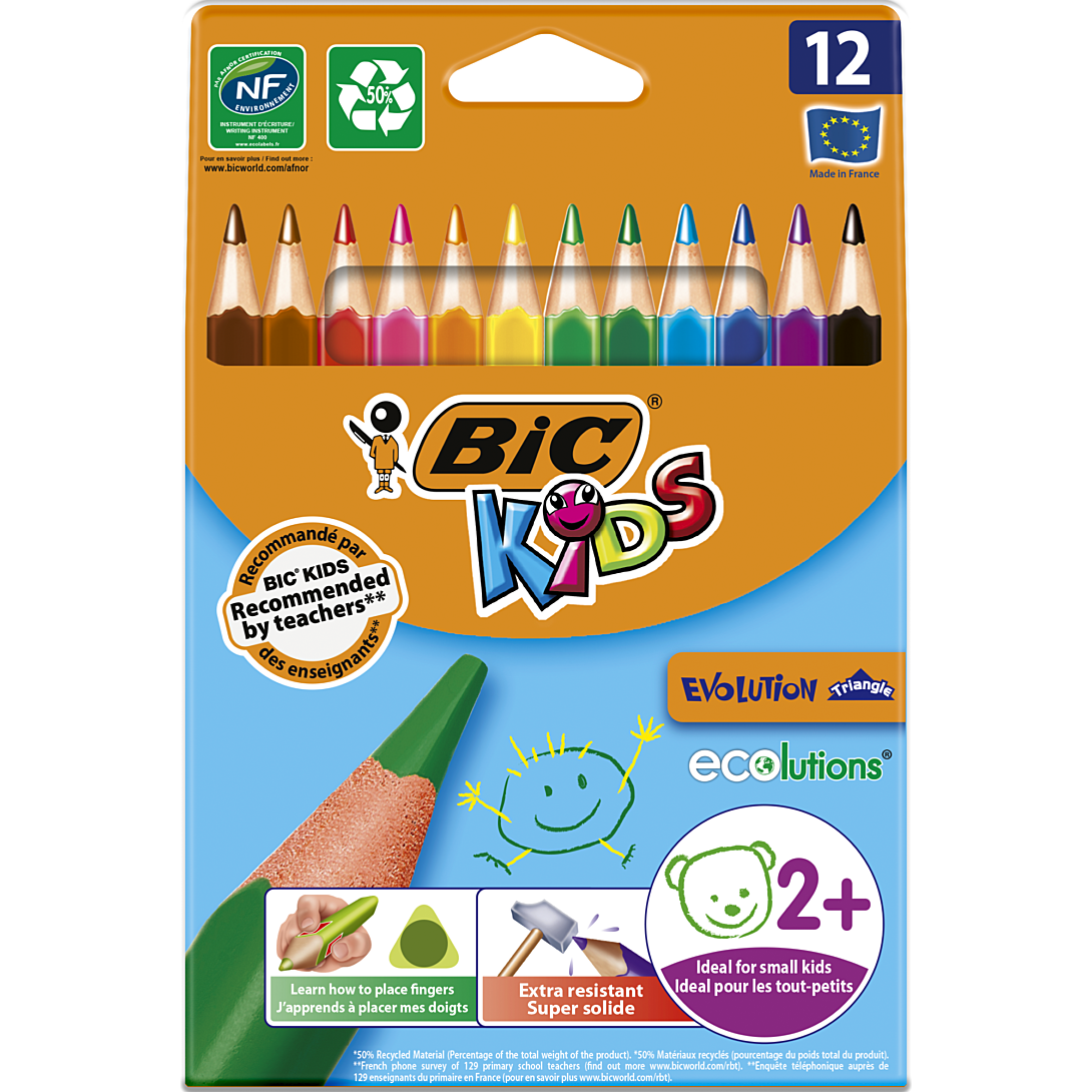 Passer le carrousel d'imagesLes crayons de couleur BIC Kids Evolution Triangle ont été conçus pour être ultra-durables et sont recommandés pour les enfants dès 2 ans. Cet étui carton contient 12 crayons, 10 et deux supplémentaires, en 12 couleurs intenses que les enfants adorent. La forme triangulaire aide les enfants à trouver comment placer correctement leurs doigts, une aptitude indispensable qui leur servira lorsqu’ils apprendront à écrire. Ces jolis crayons longs de 14 cm sont spécialement conçus pour les petites mains. Avec leur taille plus grande, ces crayons de couleur sont un bien meilleur choix pour un usage quotidien. Les enfants peuvent créer, colorier, s’exercer à tenir un crayon et s’amuser à apprendre toutes les couleurs dans le pot. Ces crayons de couleur robustes et fiables présentent une mine de 4,3 mm en moyenne, à base de pigments pour un fort pouvoir couvrant. Ils sont fabriqués dans les usines BIC en Europe suivant une expertise inégalée.