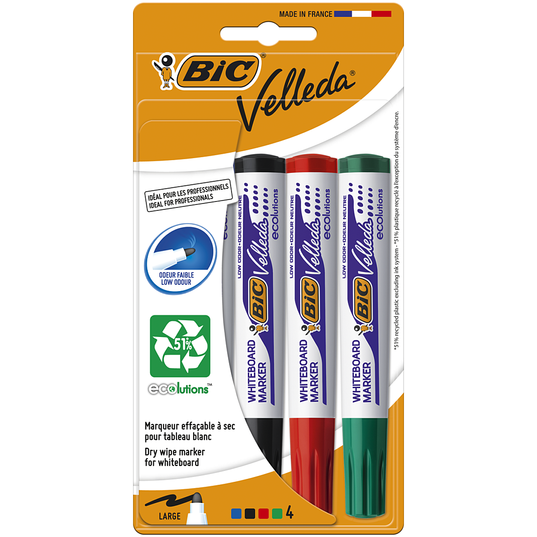 | Libellé | BIC Velleda 1701 ECOlutions Feutres pour Tableau Blanc Effaçables à Sec à Pointe Conique Moyenne - Couleurs Assorties, Blister de 4 |