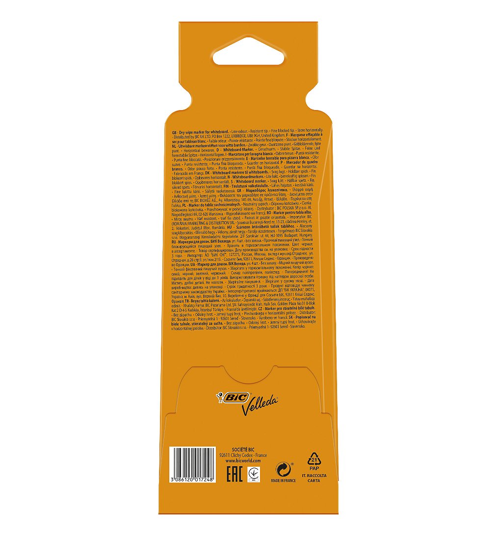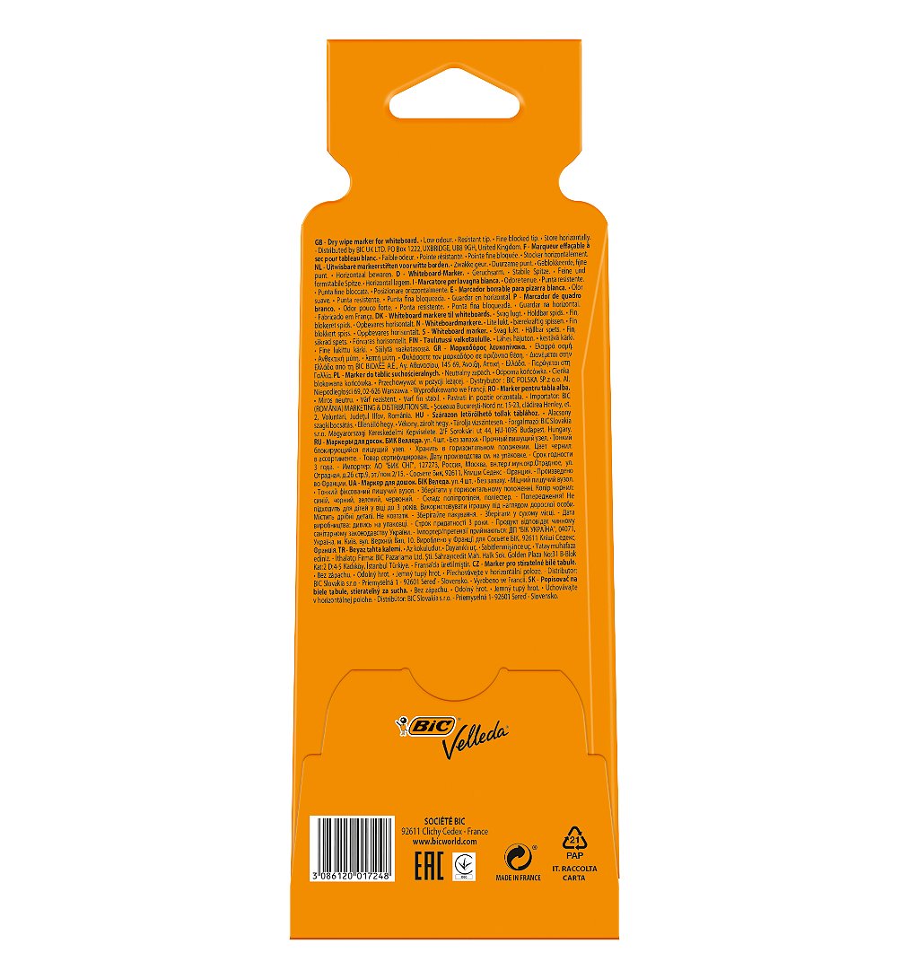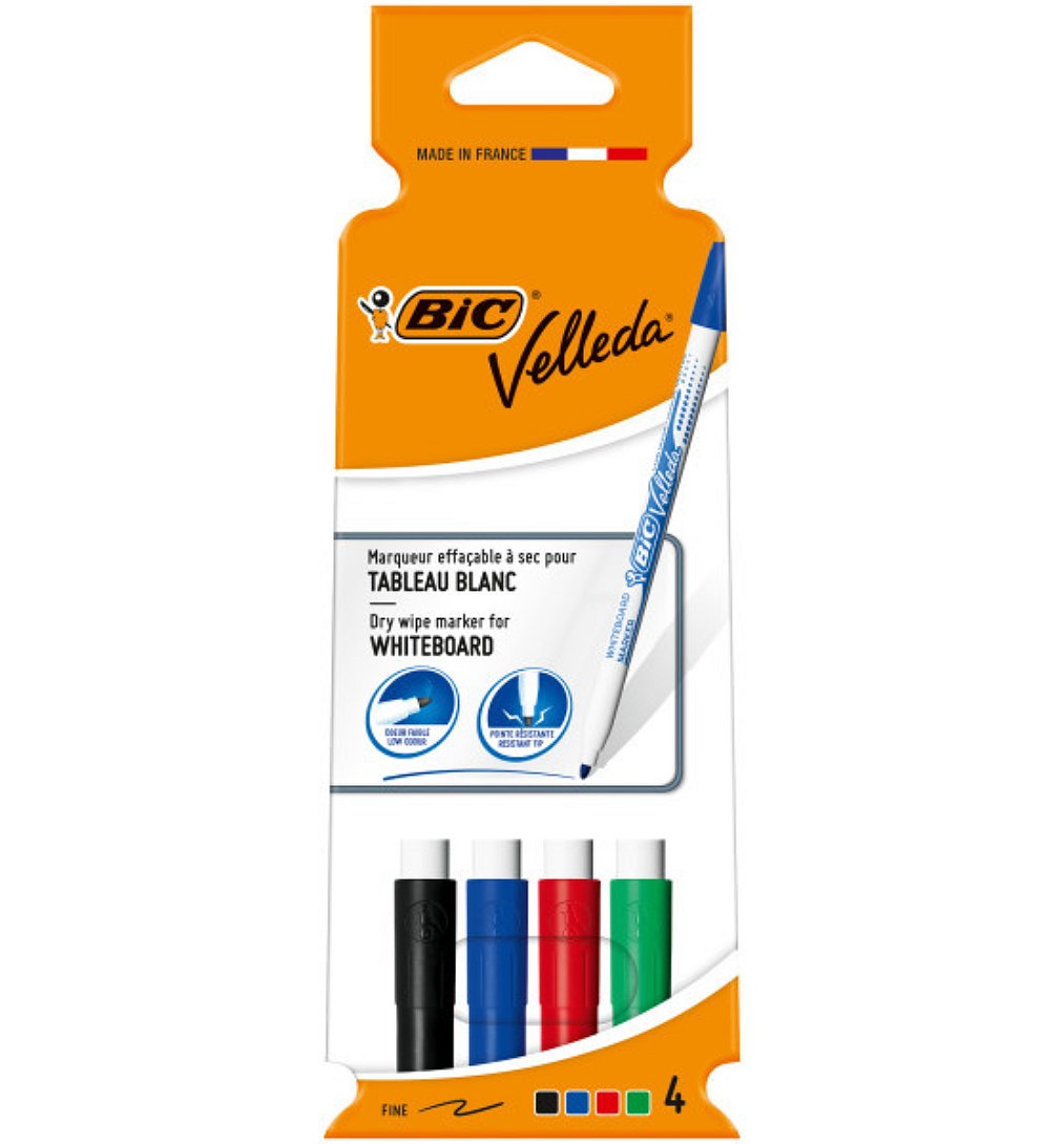 Passer le carrousel d'imagesCes 4 marqueurs effaçables à sec BIC Velleda 1721 ont adoptés un format feutre fin pour convenir aux travaux précis, à la maison ou à l'école. Ils sont disponibles en quatre couleurs classiques : noir, bleu, rouge et vert, leur capuchon et leur embout, assortis à la couleur de l'encre, sont là pour vous le rappeler. Ils s'effacent facilement, même après plusieurs jours et leur pointe ogive, bloquée, ne s'enfonce pas à la pression de l'écriture. De faible odeur, ces feutres pour tableaux blancs sont fabriqués en France.