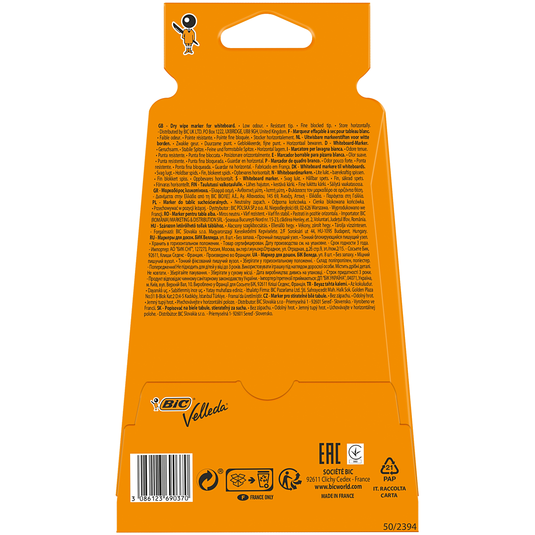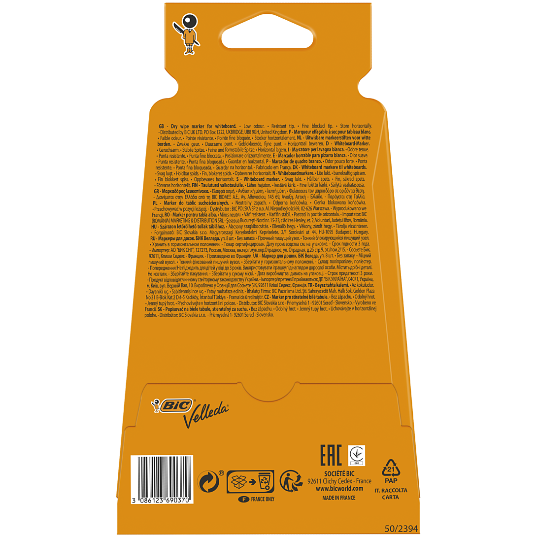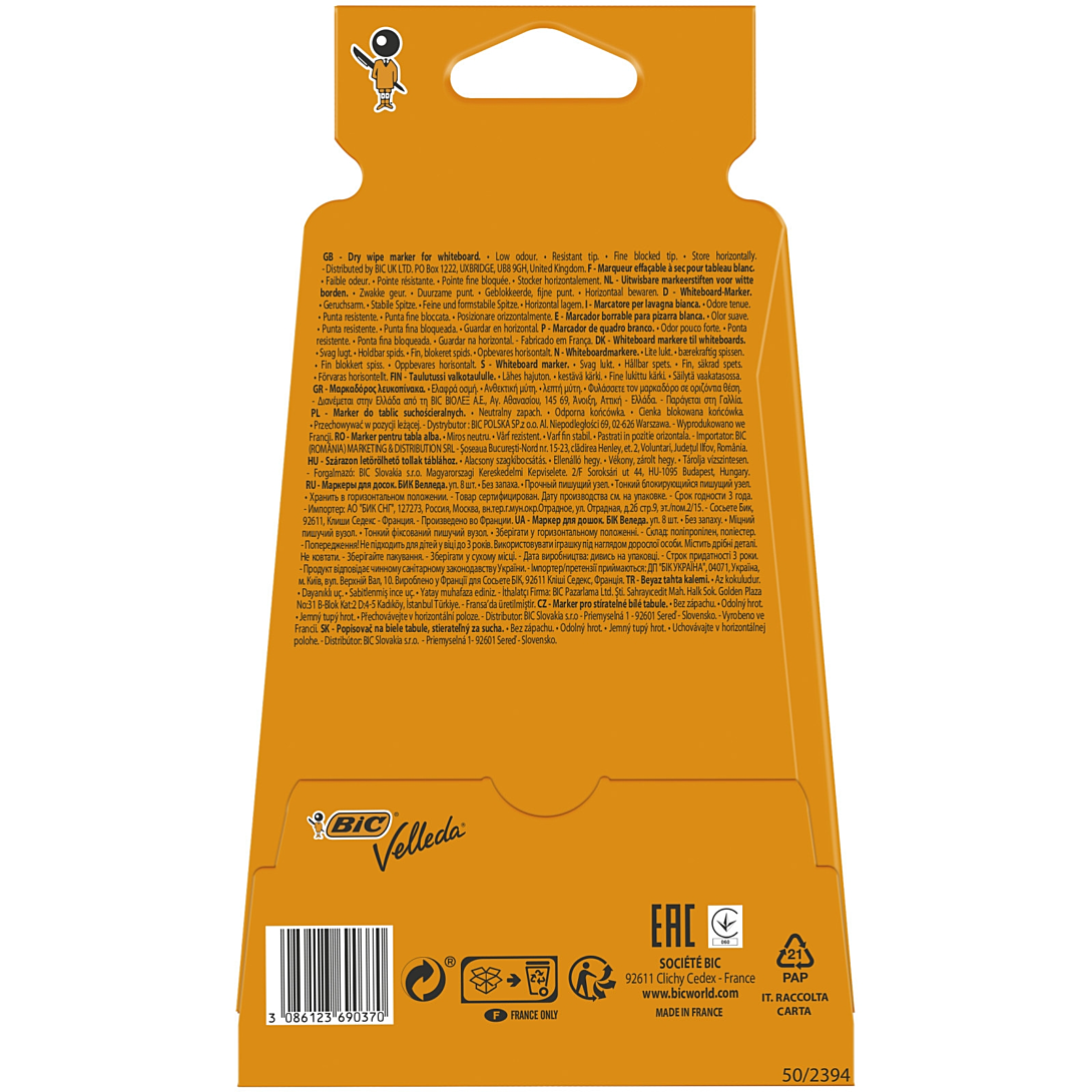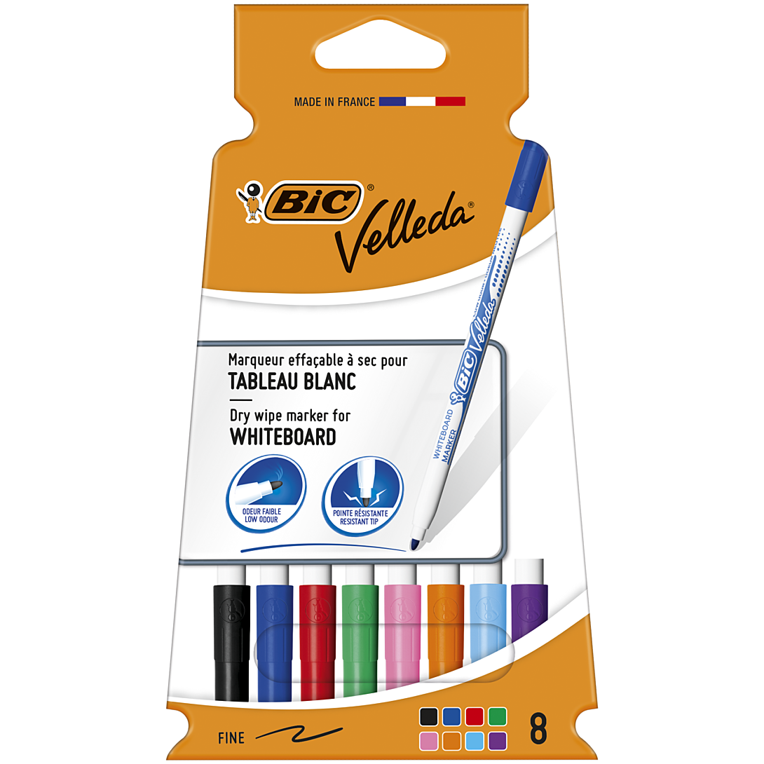 Passer le carrousel d'imagesCes 8 marqueurs effaçables à sec BIC Velleda 1721 ont adopté un format feutre fin pour convenir aux travaux précis, à la maison ou à l'école. Leur encre pigmentée disponible en 8 couleurs intenses (noir, bleu, rouge, vert, bleu marine, orange, violet et marron) fait nettement ressortir l'écriture, et s'efface facilement. Leur pointe ogive est bloquée et ne s'enfonce pas à la pression de l'écriture. De faible odeur, ces feutres pour tableaux blancs sont fabriqués en France.