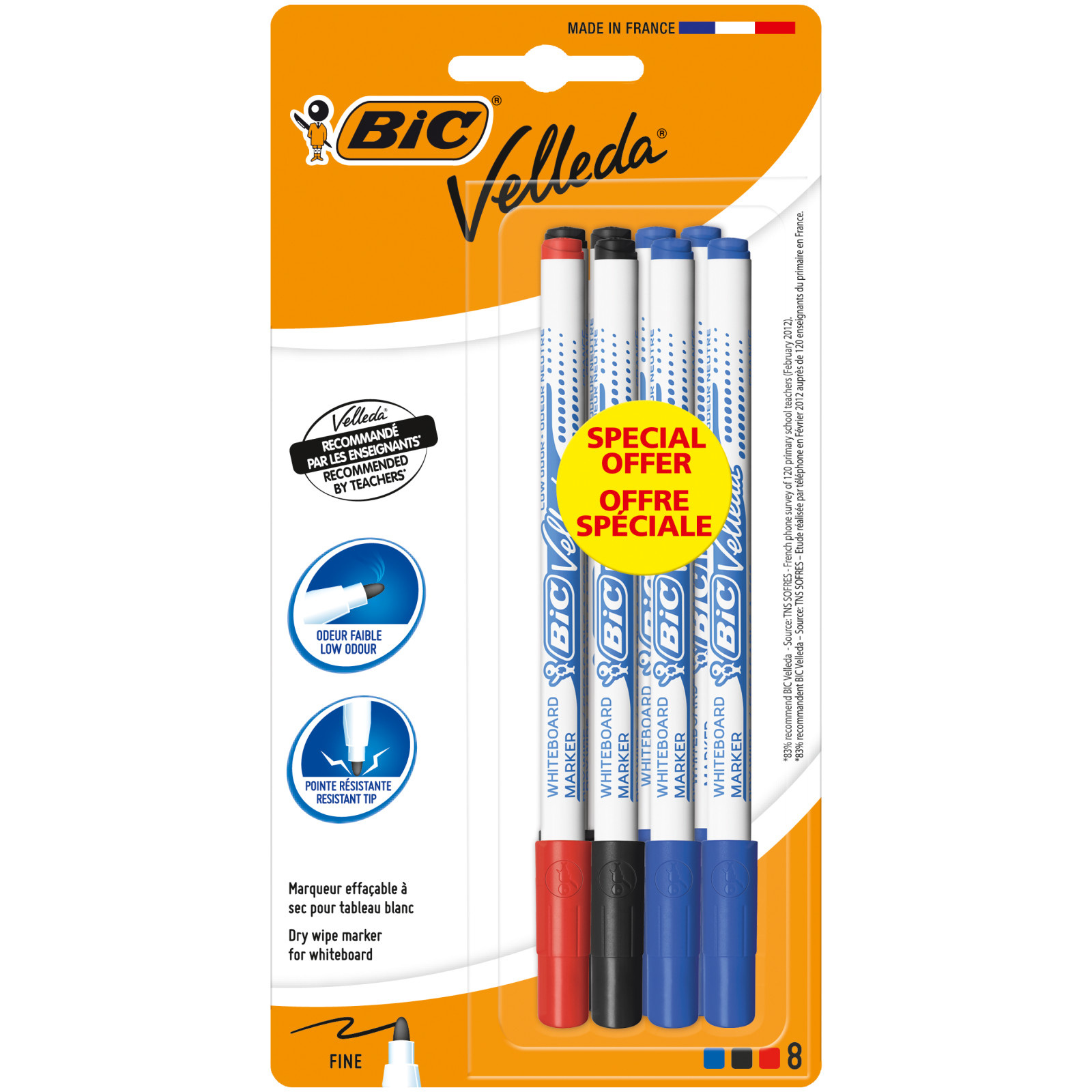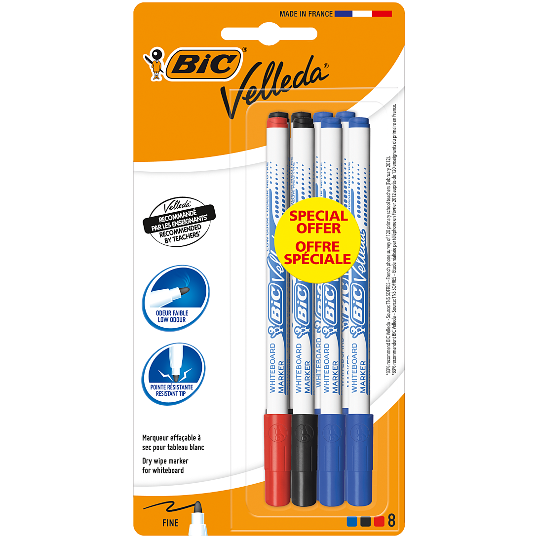 Passer le carrousel d'imagesCes 8 marqueurs effaçables à sec BIC Velleda 1721 ont adopté un format feutre fin pour convenir aux travaux précis, à la maison ou à l'école. Leur encre pigmentée disponible ici en trois couleurs classiques (bleu x4, noir x3 et rouge x1) fait ressortir l'écriture, et s'efface facilement. Leur pointe ogive est bloquée et ne s'enfonce pas à la pression de l'écriture. De faible odeur, ces feutres pour tableaux blancs sont fabriqués en France.