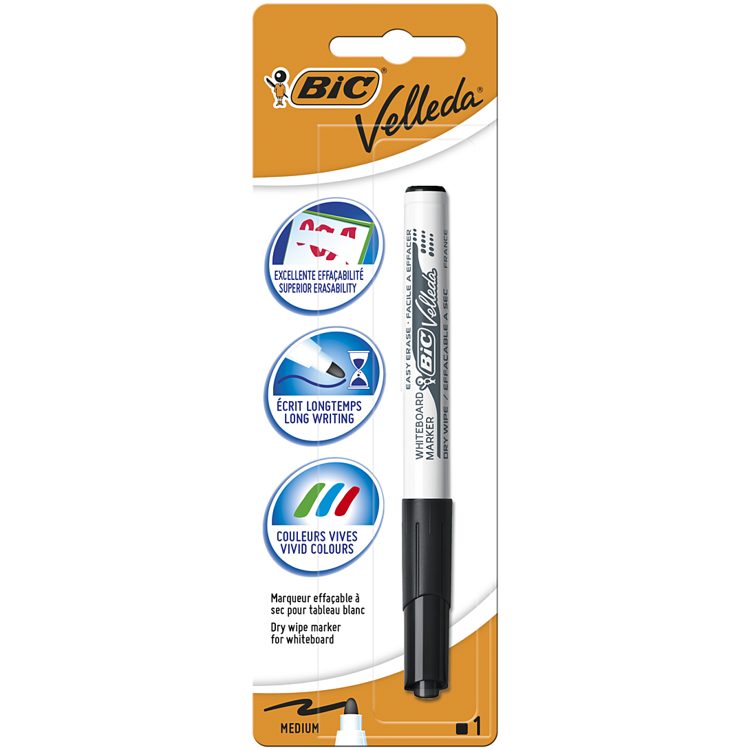 Passer le carrousel d'imagesCe feutre noir BIC Velleda écrit longtemps et s'efface très facilement. Il permet un tracé d'épaisseur moyenne (largeur de trait de 1,4 mm). Sa pointe ogive est bloquée : elle écrit sans se courber ou s'enfoncer à la pression sur tableaux blancs ou rouleaux BIC Velleda.