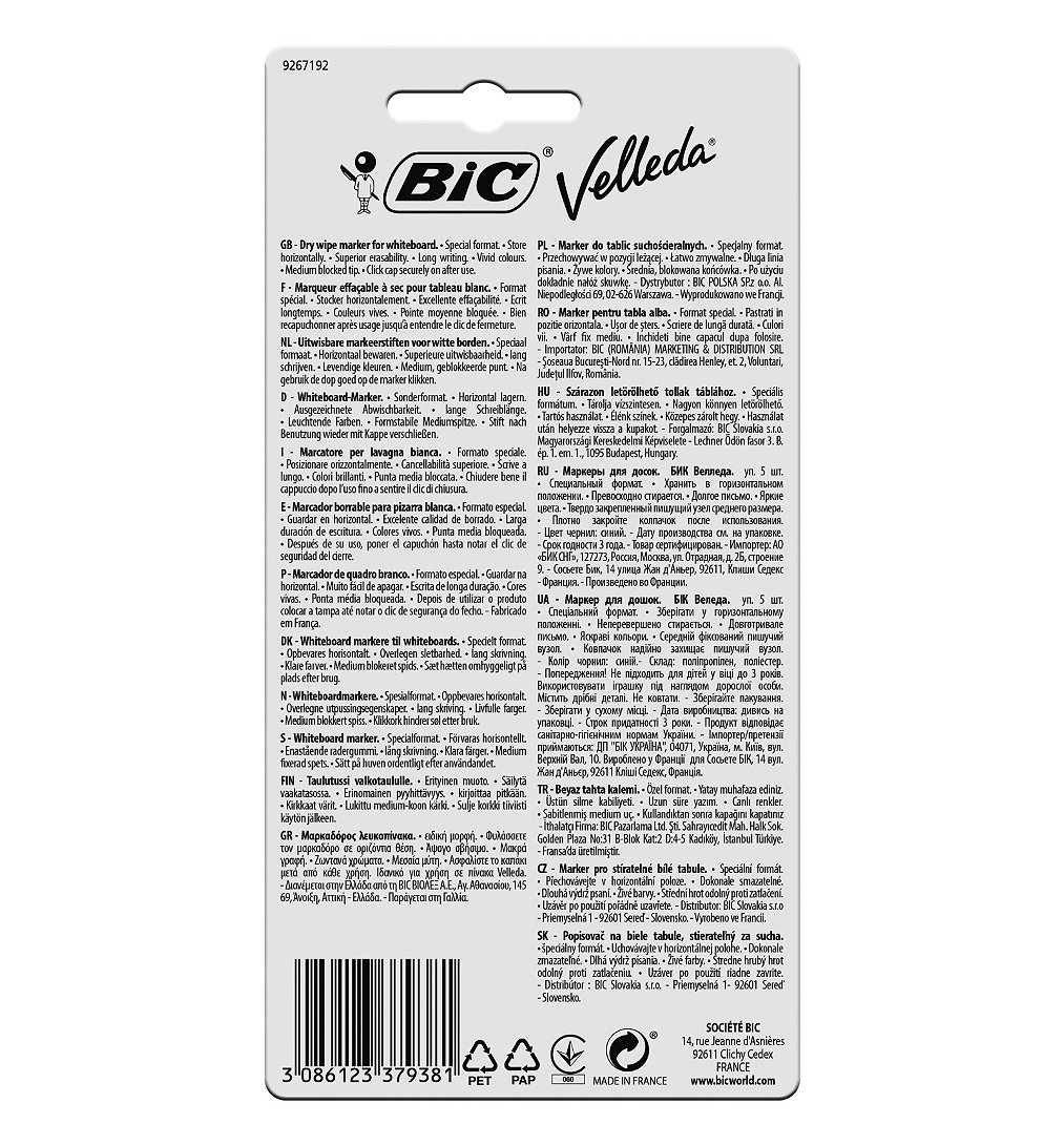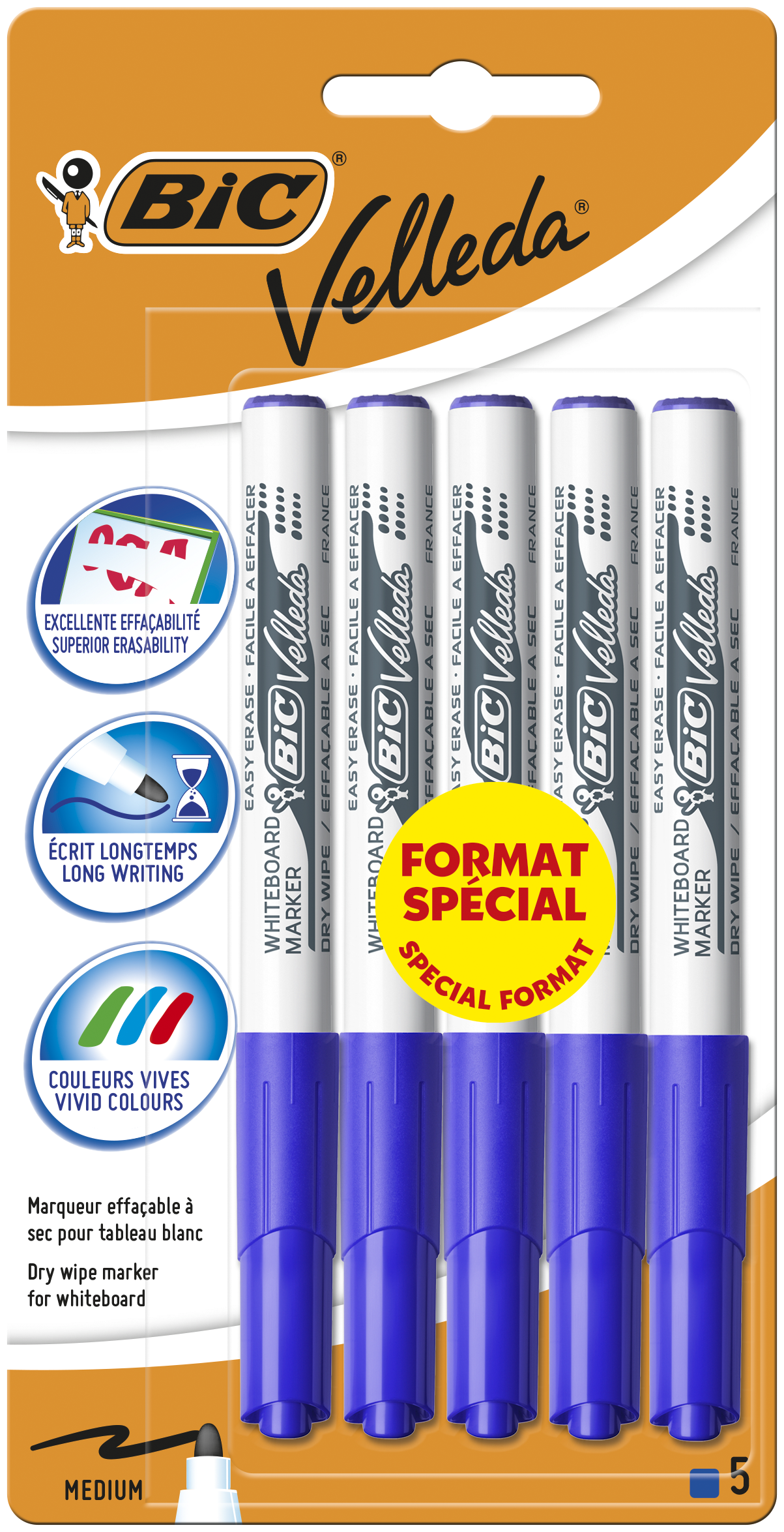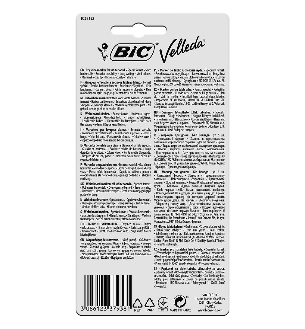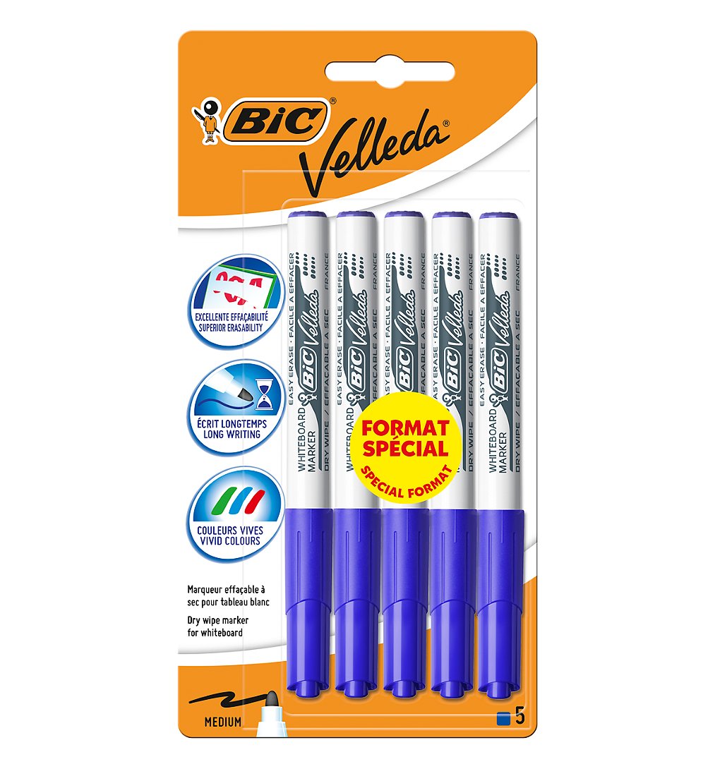 Ces 5 feutres bleus BIC Velleda 1741 écrivent longtemps et s'effacent très facilement. Ils permettent un tracé d'épaisseur moyenne (largeur de trait de 1,4 mm). Leur pointe ogive est bloquée : elle écrit sans se courber ou s'enfoncer à la pression sur tableaux blancs ou rouleaux BIC Velleda.