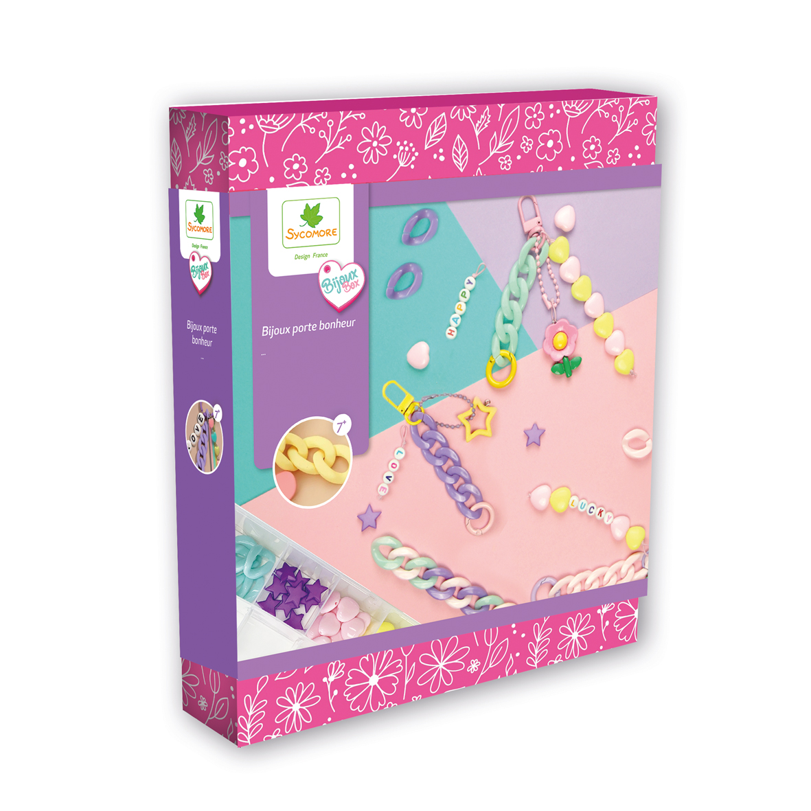 | Plus produit | Dans cette jolie boîte, retrouve tout le nécessaire pour fabriquer de magnifiques bijoux porte bonheur aux couleurs actuelles ! Cette Bijoux box contient : maillons XL, perles lettres, fermoirs, grelot, maxi charm; perles curs et 1 livret d'instructions. |