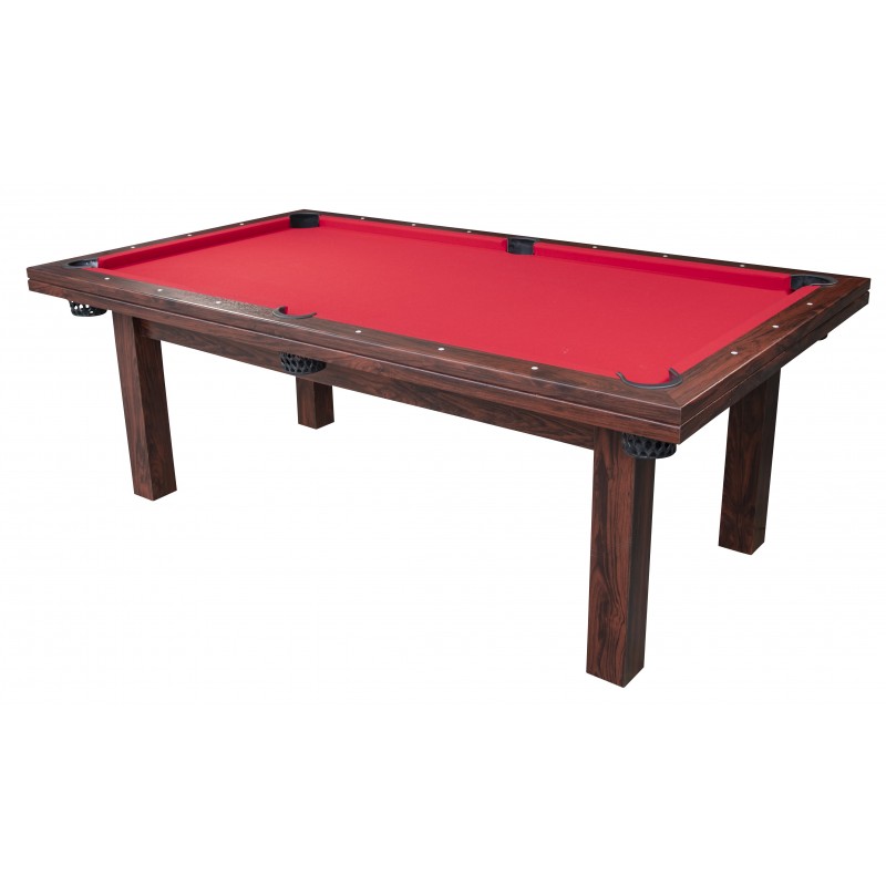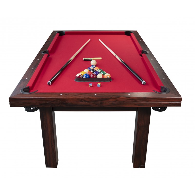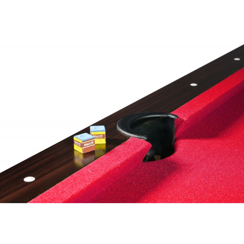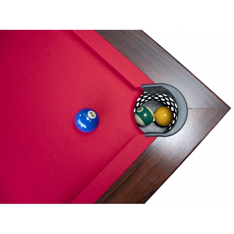 Le tapis de jeu en laine, de couleur rouge, recouvre la surface de jeu de 1m90 sur 98 cm. Il favorise le roulement des boules grâce à sa planéité parfaite. Les bandes en caoutchouc permettent un très bon renvoi vers les poches à boules situées sous les trous de 10cm de diamètre et limitent ainsi les bruits liés aux chocs.