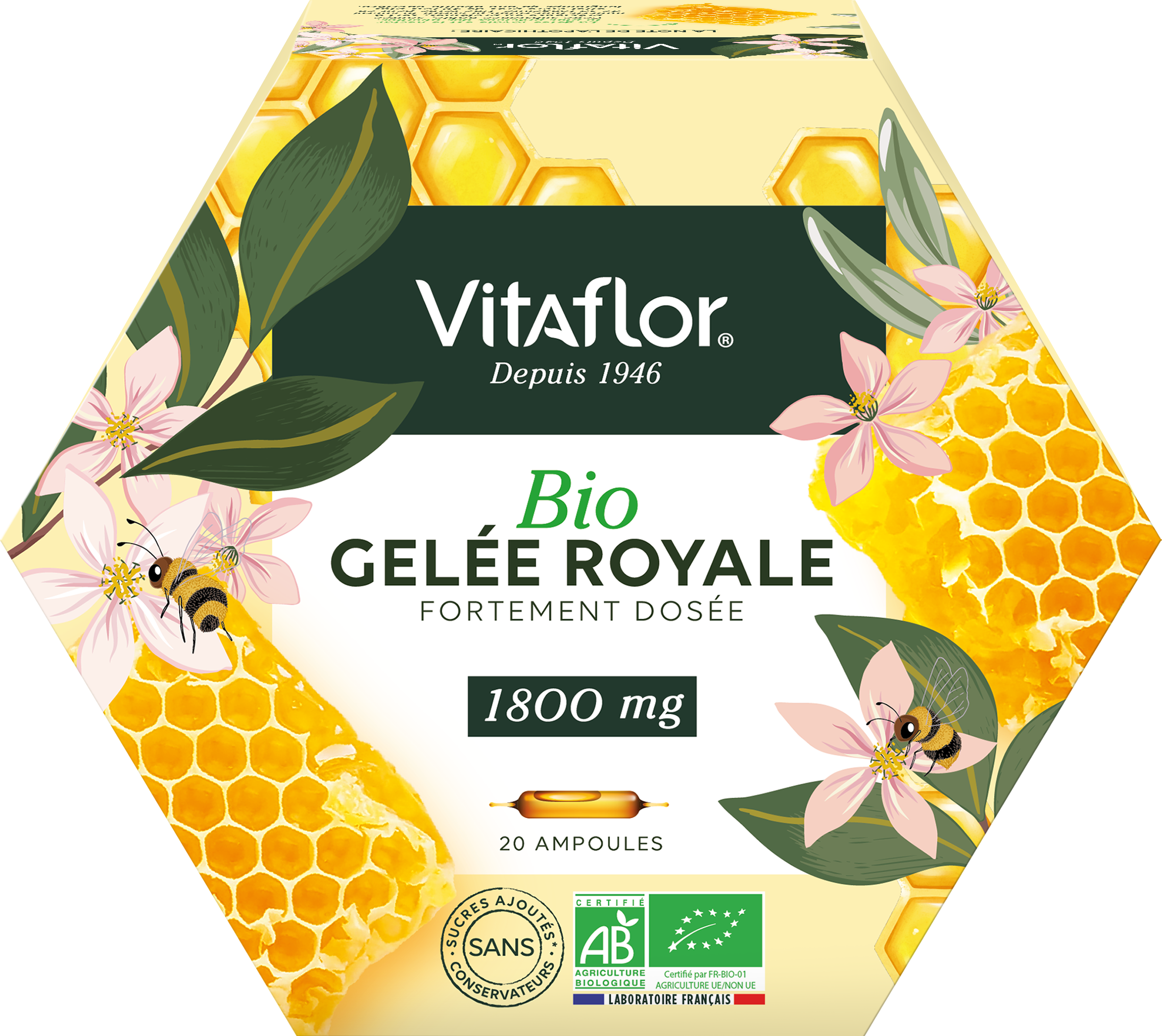 VITAFLOR prépare rigoureusement sa formule Bio gelée royale avec un haut dosage de 1 800 mg pour vous en restituer tous ses bienfaits. Véritable concentré nutritif, elle est reconnue pour sa teneur en acides aminés, minéraux et vitamines, nécessaires au bon fonctionnement de l’organisme.