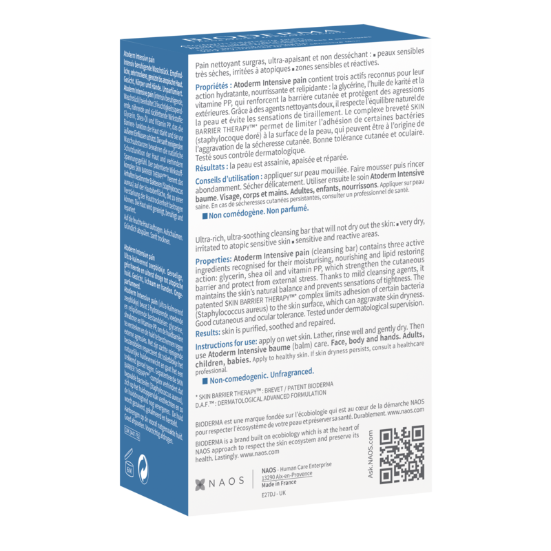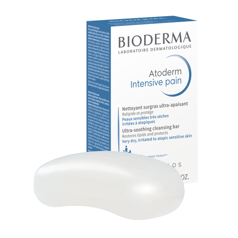Ce pain de savon surgras est enrichi en agents nourrissants et relipidants : la glycérine, l'huile de karité et la vitamine PP. Il nettoie ainsi les peaux sensibles très sèches, irritées à atopiques, sans dessécher. Ces actifs apportent notamment une action hydratante et réduisent durablement les sensations de tiraillements. Ce pain surgras visage et corps est doté du complexe breveté SKIN BARRIER THERAPYTM. Il permet d'équilibrer les bactéries à la surface de la peau, responsables notamment de la sécheresse cutanée. Atoderm Intensive Pain dispose d'une bonne tolérance cutanée et oculaire. Il convient ainsi à toute la famille sauf aux nourrissons prématurés. Ce produit est formulé et fabriqué en France.