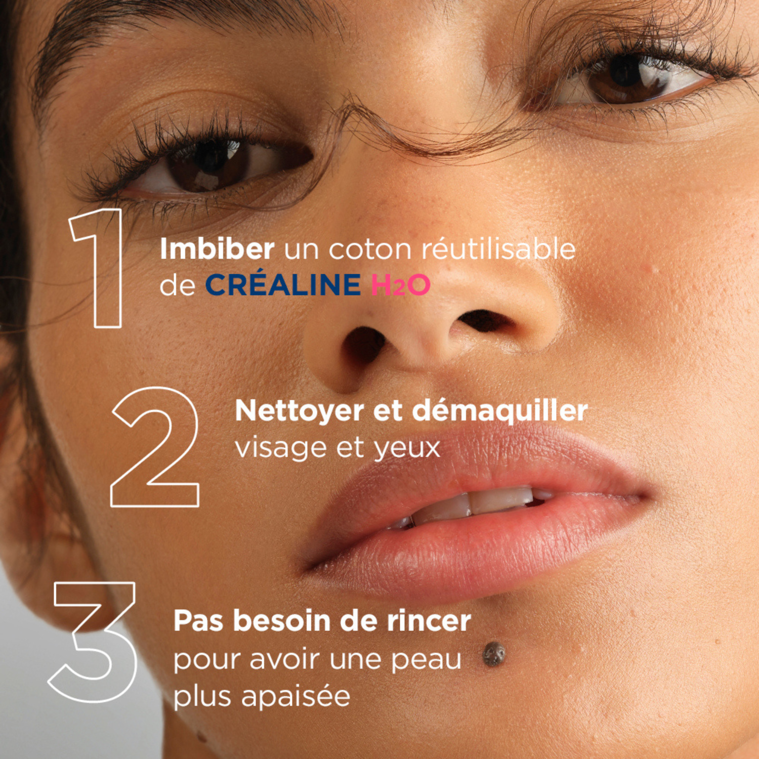 Créaline H2O garantit un nettoyage et un démaquillage en douceur du visage et des yeux et favorise l’élimination des résidus de pollution et de pollen. Inspirées de la structure biologique des lipides de la peau, ses micelles éliminent les impuretés tout en respectant l’équilibre cutané. Les actifs dermatologiques apaisants aident à prévenir les sensations d’irritation. Le complexe breveté D.A.F.™* augmente le seuil de tolérance des peaux les plus sensibles. Haute tolérance cutanée et oculaire. Testé sous contrôle dermatologique et ophtalmologique.