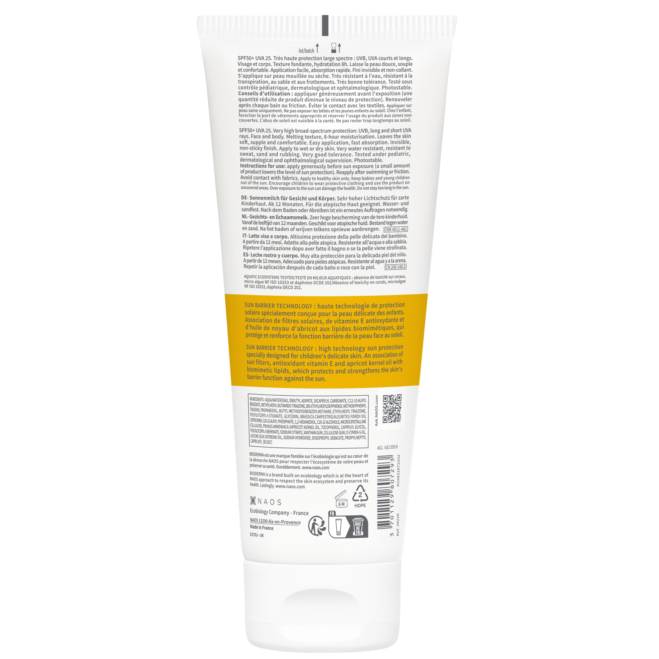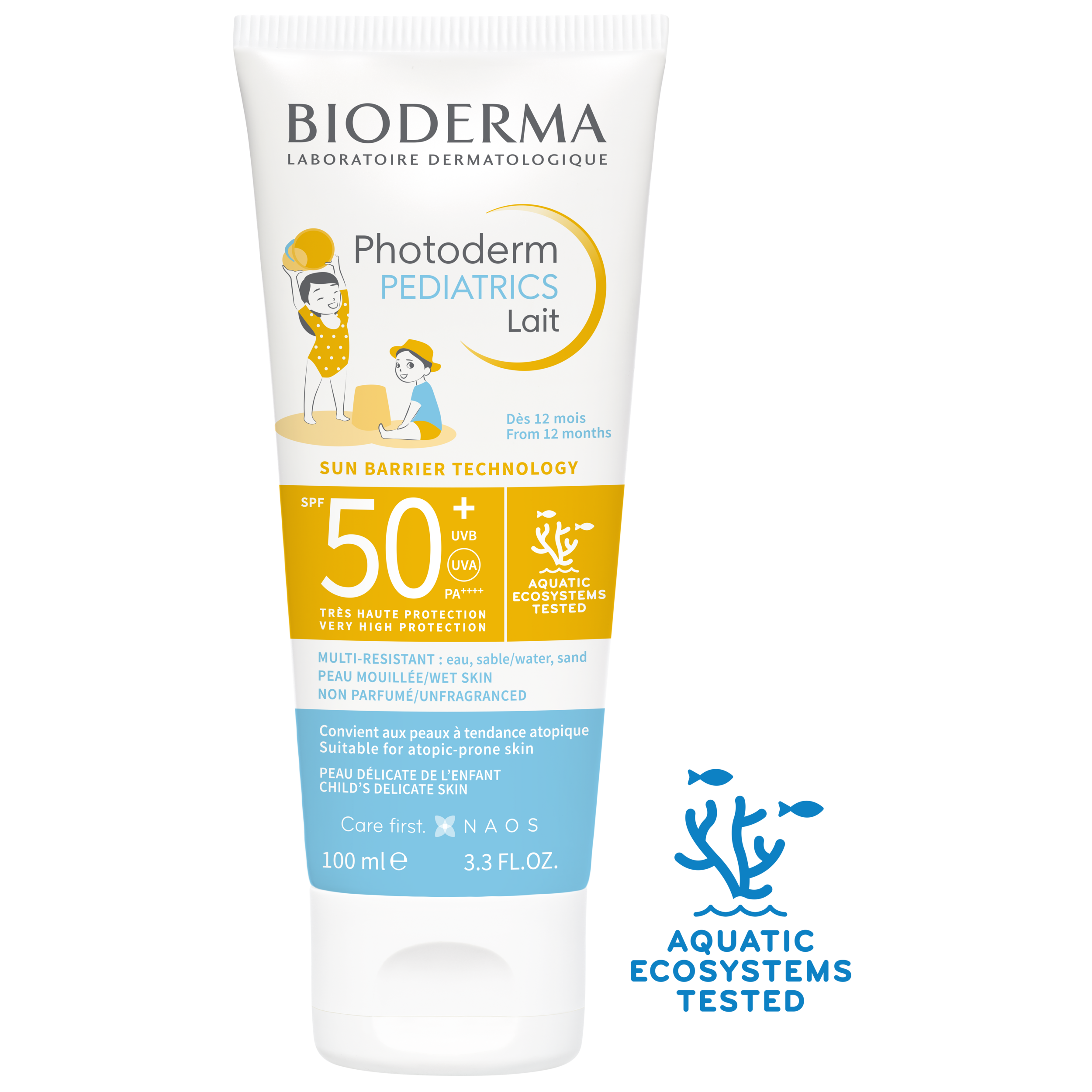 SPF50+ UVA 25. Très haute protection large spectre : UVB, UVA courts et longs. Visage et corps. Texture fondante, hydratation 8h. Laisse la peau douce, souple et confortable. Application facile, absorption rapide. Fini invisible et non-collant. S'applique sur peau mouillée ou sèche. Très résistant à l’eau, résistant à la transpiration, au sable et aux frottements. Très bonne tolérance. Testé sous contrôle pédiatrique, dermatologique et ophtalmologique. Photostable.
