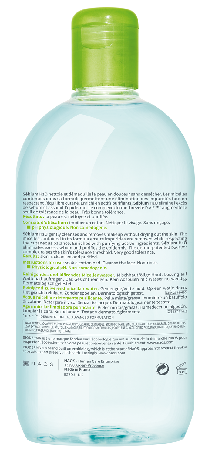 "Sébium H2O est le moyen le plus rapide et le plus simple d'enlever efficacement le maquillage et les impuretés de votre visage sans agresser votre peau sensible. Cette eau micellaire a été conçue spécialement pour les peaux mixtes à grasses. Sa formule est très bonne tolérance, non comédogène. Aussi douce que purifiante, elle régule l'excès de sébum et purifie sans assécher. De plus, son complexe D.A.F permet d'augmenter le seuil de tolérance des peaux sensibles. Idéale pour un nettoyage profond en douceur, cette lotion micellaire s'utilise quotidiennement. Ce produit est formulé et fabriqué en France."