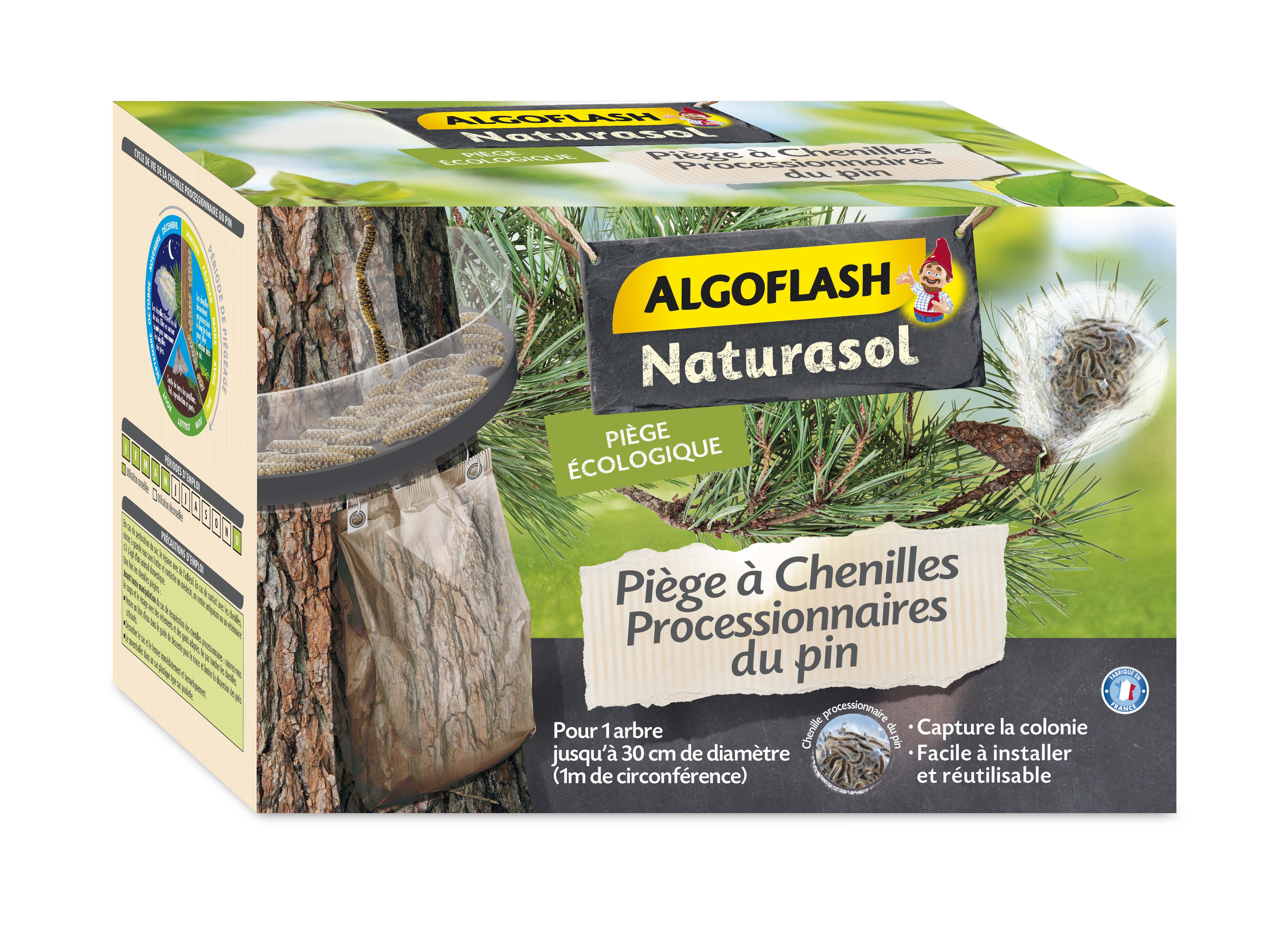 Piège à chenilles processionnaires du pin. Placer le piège autour du tronc des pins pour capturer les chenilles processionnaires du pin lorsqu'elles descendent de leurs nids pour aller s'enterrer. Une solution alternative aux produits chimiques, basé sur le mode de vie des chenilles. Facile et rapide à poser. Efficace et discret avec son sac de récupération imprimé écorce de pin.