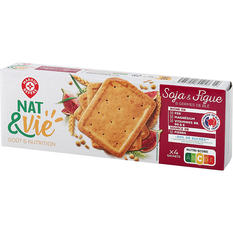 Ingrédients : Farine de blé 44 % ; sucre ; huile de colza ; flocons de soja 9,6 % ; pâte de figue 5,9 % ; farine complète de blé 5,2 % ; germes de blé 4,8 % ; fructo-oligosaccharides ; jus de soja 2 % ; poudres à lever : E500, E450 ; arôme naturel de figue ; sel ; fibres d'avoine ; émulsifiant : lécithines ; magnésium ; fer ; vitamine E ; niacine (vitamine B3) ; vitamine B6 ; thiamine (vitamine B1) ; acide folique (vitamine B9).