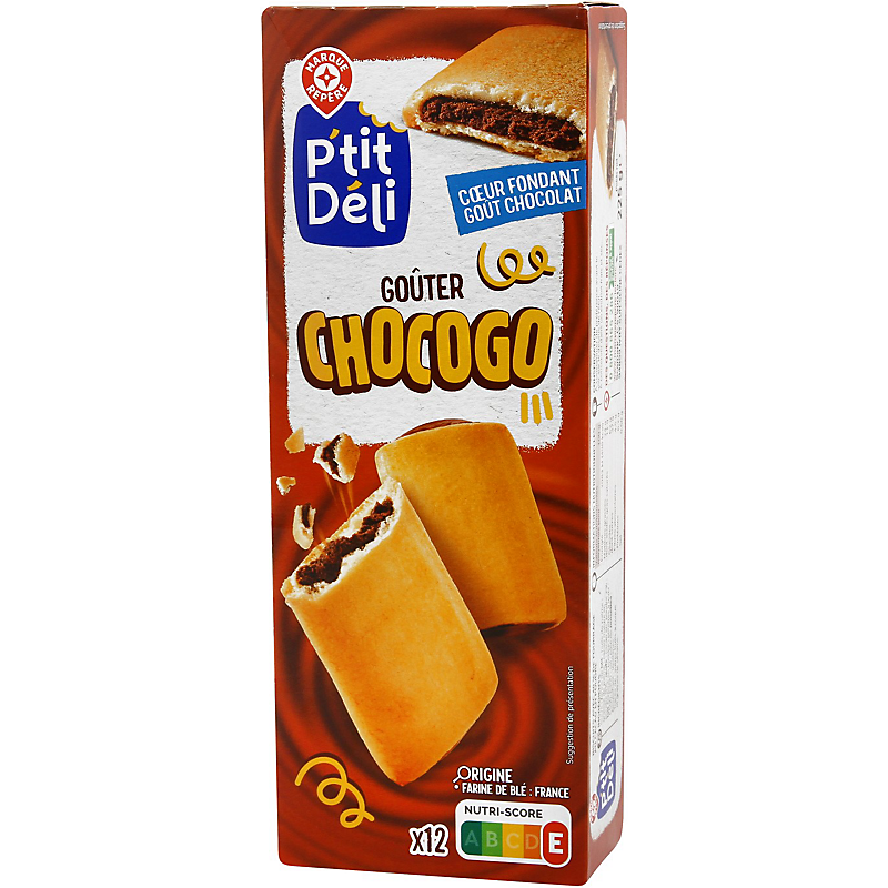 Ingrédients : Sucre ; farine de blé ; huile de palme ; graisse de palme ; cacao maigre en poudre 8% ; oeufs ; cacao en poudre 2% ; lait écrémé en poudre ; poudres à lever : E500, E300 ; sel ; pâte de noisettes ; émulsifiant : lécithines.