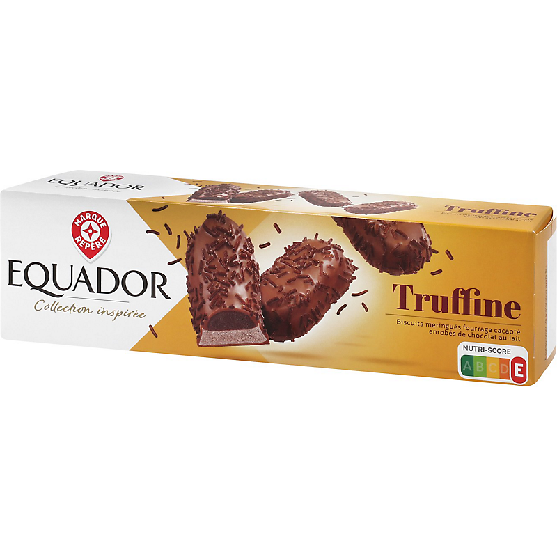 Biscuits meringués avec 55 % de fourrage cacaoté, enrobés de chocolat au lait et vermicelles de chocolat EQUADOR