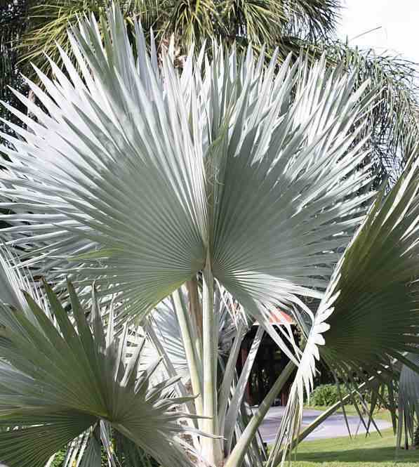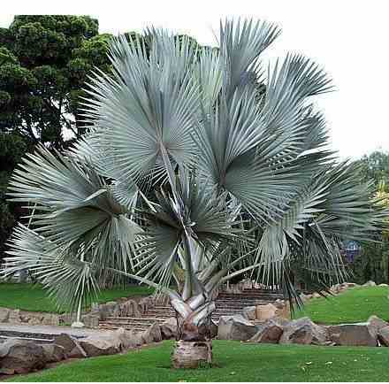 Le palmier de Bismarck se remarque par sa belle couronne de grandes palmes circulaires bleu argenté en forme d'éventail avec un grand tronc colonnaire. Les jeunes plantes ont des palmes teintées d'une couleur rouge pourpre. Le Bismarckia grandit assez rapidement
