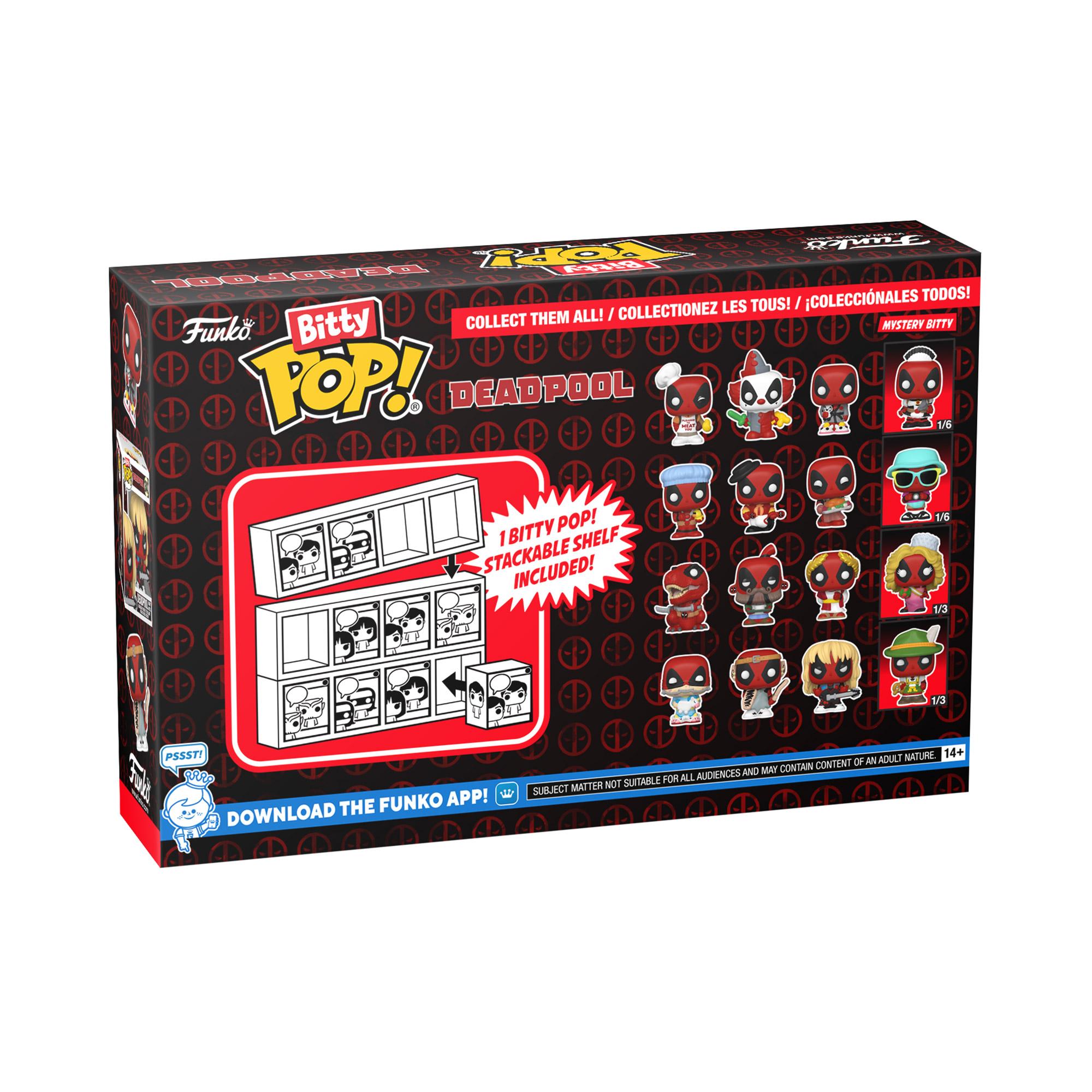 Votre mercenaire préféré avec une gueule Pops ! ont été réduits en Bitty Pops ! Agrandissez votre collection Deadpool avec cet assortiment de Bitty Pop ! figurines représentant l'anti-héros le plus emblématique du moment ! Ce pack de 4 comprend Bitty Pop ! Deadpool (Backyard Griller), Bitty Pop! Deadpool (Clown), Bitty Pop! Deadpool (Bedtime) et un mystère Bitty Pop ! chiffre. Le possible mystère Bitty Pops ! sont Rare (1/3) Deadpool (Lederhosen), Rare (1/3) Deadpool (Concours de beauté), Hyper Rare (1/6) Deadpool (Touriste) et Hyper Rare (1/6) Deadpool (French Maid). Bitty Pops! sont emballés dans des étuis rigides en acrylique avec des couvercles inférieurs amovibles. Les couvercles inférieurs amovibles servent également de bases en acrylique, auxquelles le Bitty Pop ! les chiffres sont respectés. Triez et organisez vos Bitty Pops ! avec la vitrine incluse ! Les vitrines en acrylique sont empilables et peuvent contenir quatre Bitty Pop ! chiffres chacun.