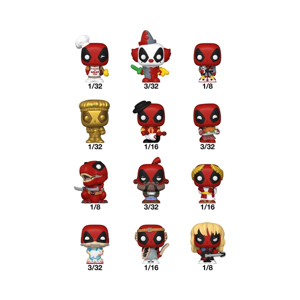 Votre mercenaire préféré avec une gueule Pops ! ont été réduits en Bitty POP! objets de collection! Agrandissez votre collection Deadpool avec cet assortiment de Bitty POP ! figurines représentant l'anti-héros le plus emblématique du moment ! Chaque Bitty POP! est livré dans un emballage mystère et comprend une figurine à collectionner. Qui allez-vous trouver ? Il y a Bitty POP ! Deadpool (Backyard Griller) (1/32), Bitty POP! Deadpool (Clown) (3/32), Bitty POP! Deadpool (Heure du coucher) (1/8), Bitty POP! Deadpool (L'heure du bain) Or (1/32), Bitty POP! Deadpool (Flamenco) (1/16), Bitty POP! Deadpool (Supper Hero) (3/32), Bitty POP! Dinopool (1/8), Bitty POP! Deadpool (Barista) (3/32), Bitty POP! Deadpool (sénateur romain) (1/16), Bitty POP! Deadpool (Soirée pyjama) (3/32), Bitty POP! Deadpool (GN) (1/16) et Bitty POP! Deadpool (métal lourd) (1/8). Petit POP ! les objets de collection sont emballés dans des étuis rigides en acrylique avec des couvercles inférieurs amovibles.