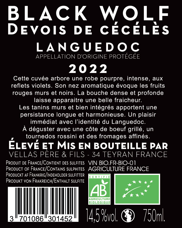 | Libellé | Black Wolf - Devois de Cécélès, 2022 - Languedoc AOP - Rouge - 75 cl |