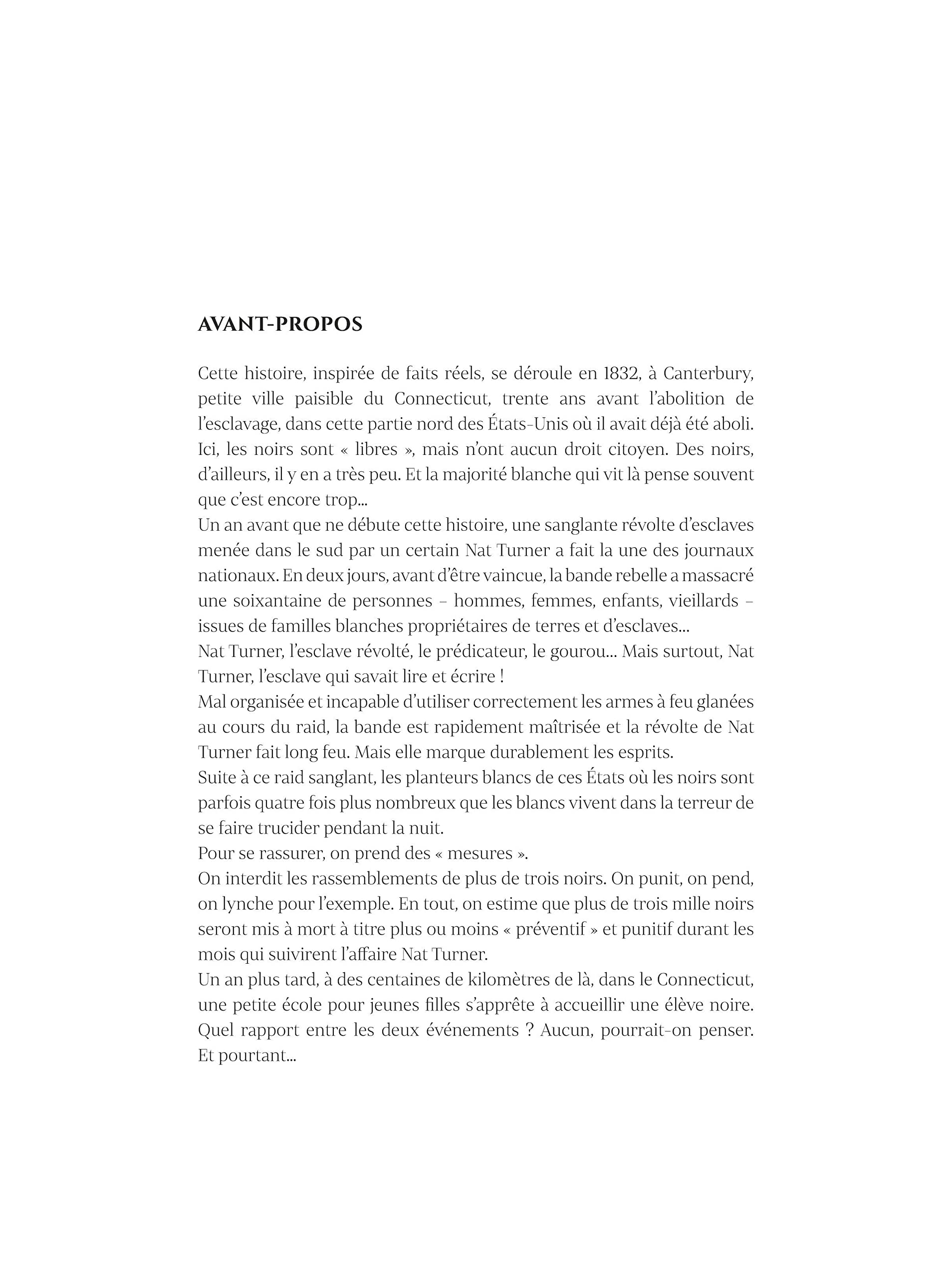 La population blanche locale voit immédiatement cette « exception » comme une menace. Même si l’esclavage n’est plus pratiqué dans la plupart des États du Nord, l’Amérique blanche reste hantée par le spectre de Nat Turner : un an plus tôt, en Virginie, cet esclave noir qui savait lire et écrire a pris la tête d’une révolte sanglante. Pour les habitants de Canterbury, instruction rime désormais avec insurrection. Ils menacent de retirer leurs filles de l’école si la jeune Sarah reste admise.