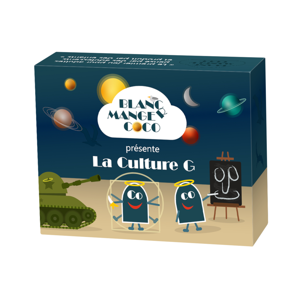 Extension du jeu Blanc Manger Coco, un jeu de cartes irrévérencieux pour l'apéro entre amis où vous aborderez le thème de la gastronomie. La Culture G est une extension de Blanc-manger Coco contenant 200 cartes, dont 160 réponses et 40 questions. La thématique du jeu est la Culture Générale, au sens large. Le principe de jeu est le même que Blanc-manger Coco, un joueur lit une phrase à trou (carte bleue) et les autres joueurs posent une carte blanches de leur jeu. La carte blanche la plus drôle marque le point.
