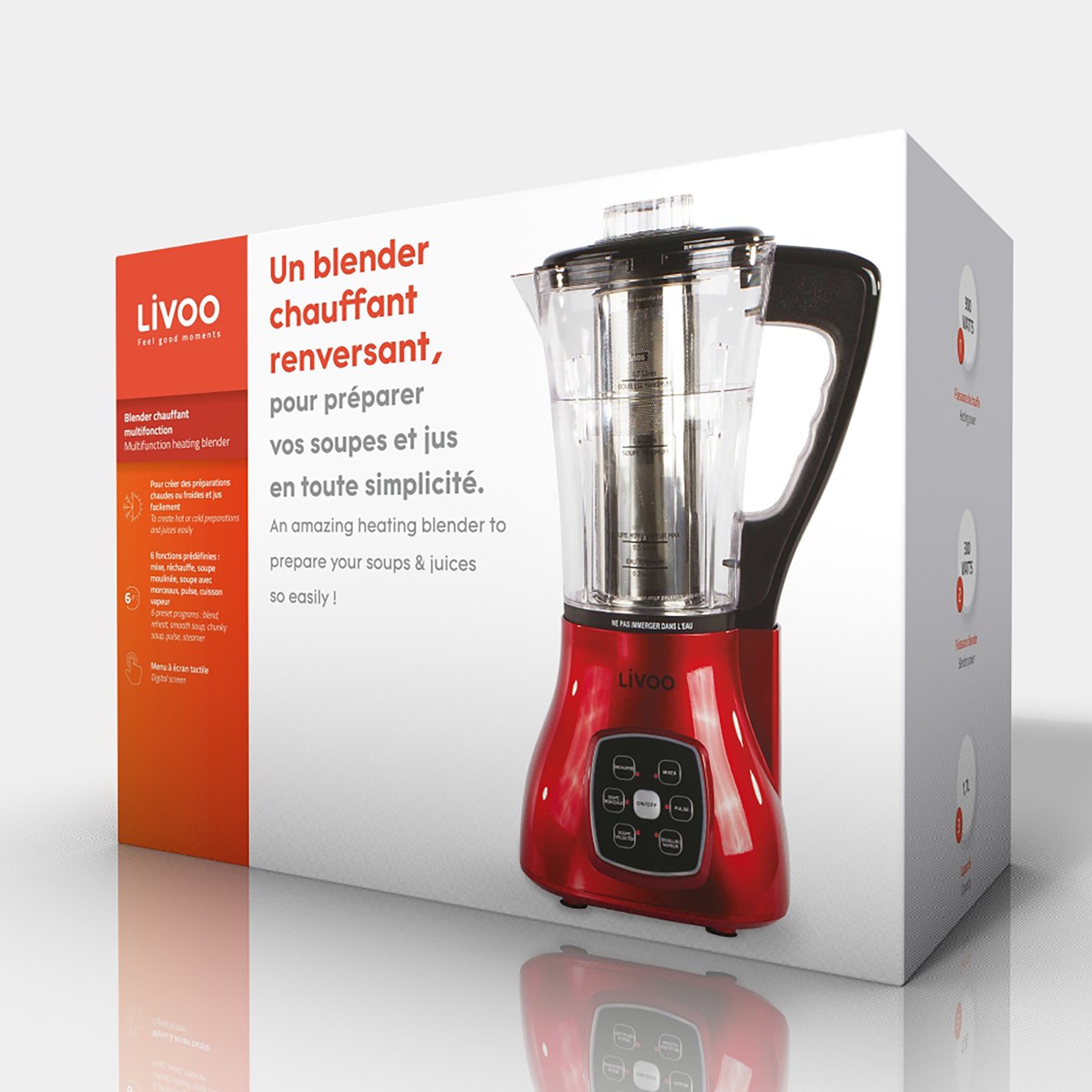 dop140r - blender chauffant multifonction 1.7l 800w rouge - Blender chauffant multifonction Domoclip DOP140R pour créer des soupes, jus, sauces, smoothies, cocktails et autres préparations chaudes ou froides, menu à écran tactile, 6 fonctions prédéfinies : mixe, réchauffe, soupe moulinée, soupe avec morceaux, pulse, cuisson vapeur, couteaux 4 lames en acier inoxydable, bol avec bec verseur d'une capacité de 1,7 L, couvercle de sécurité étanche avec bouchon doseur intégré, sécurité anti-débordement et anti-surchauffe à sec, 4 pieds antidérapants, filtre en acier inoxydable, panier à oeufs et brosse de nettoyage inclus. - Poids brut : 3.05 kg.