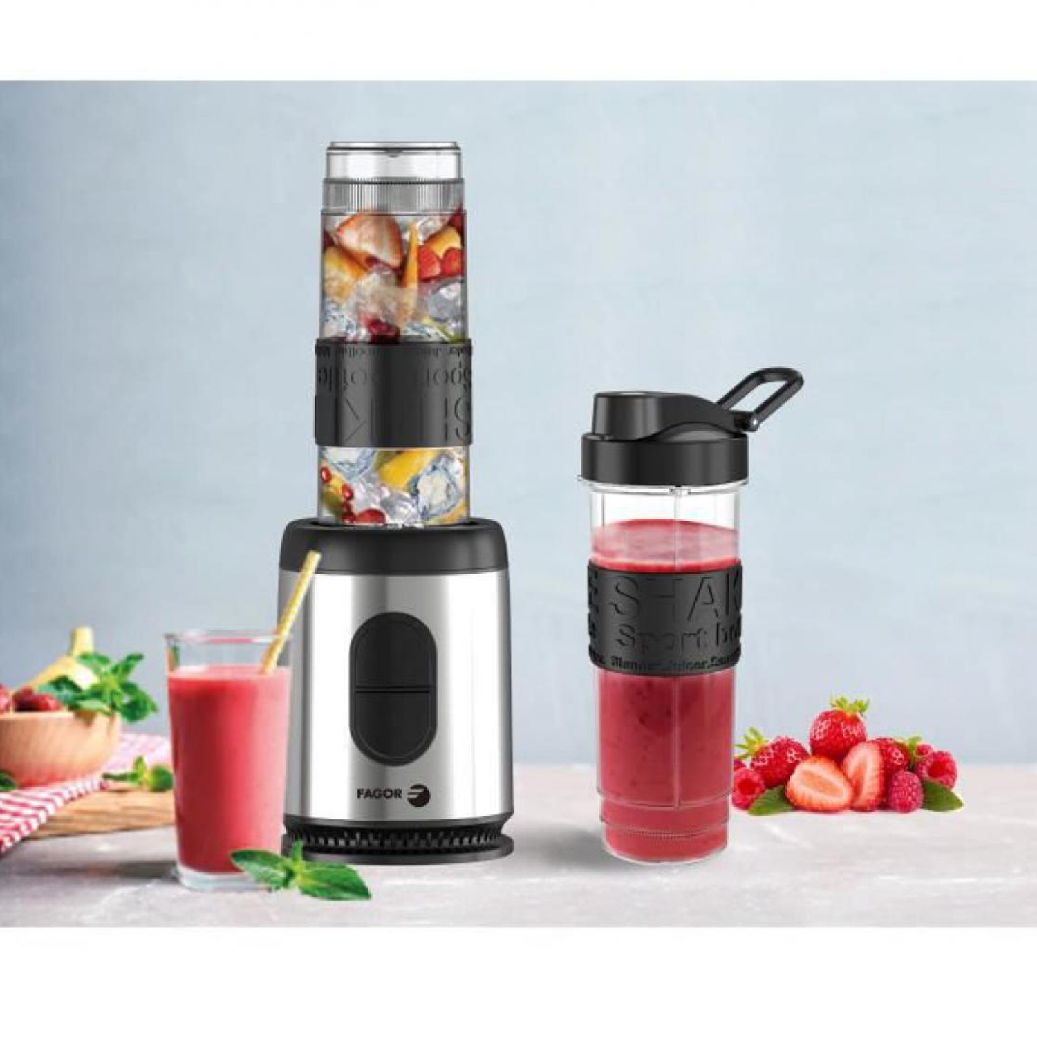 Idéal pour préparer vos smoothies à emporter, il suffit juste d'ajouter vos fruits préférer pour réaliser vos boissons rempli de vitamine en rien de temps. Avec sa capacité de 570 ml, et ces deux gourdes que vous pourrez transporter avec vous au sport au bureau.