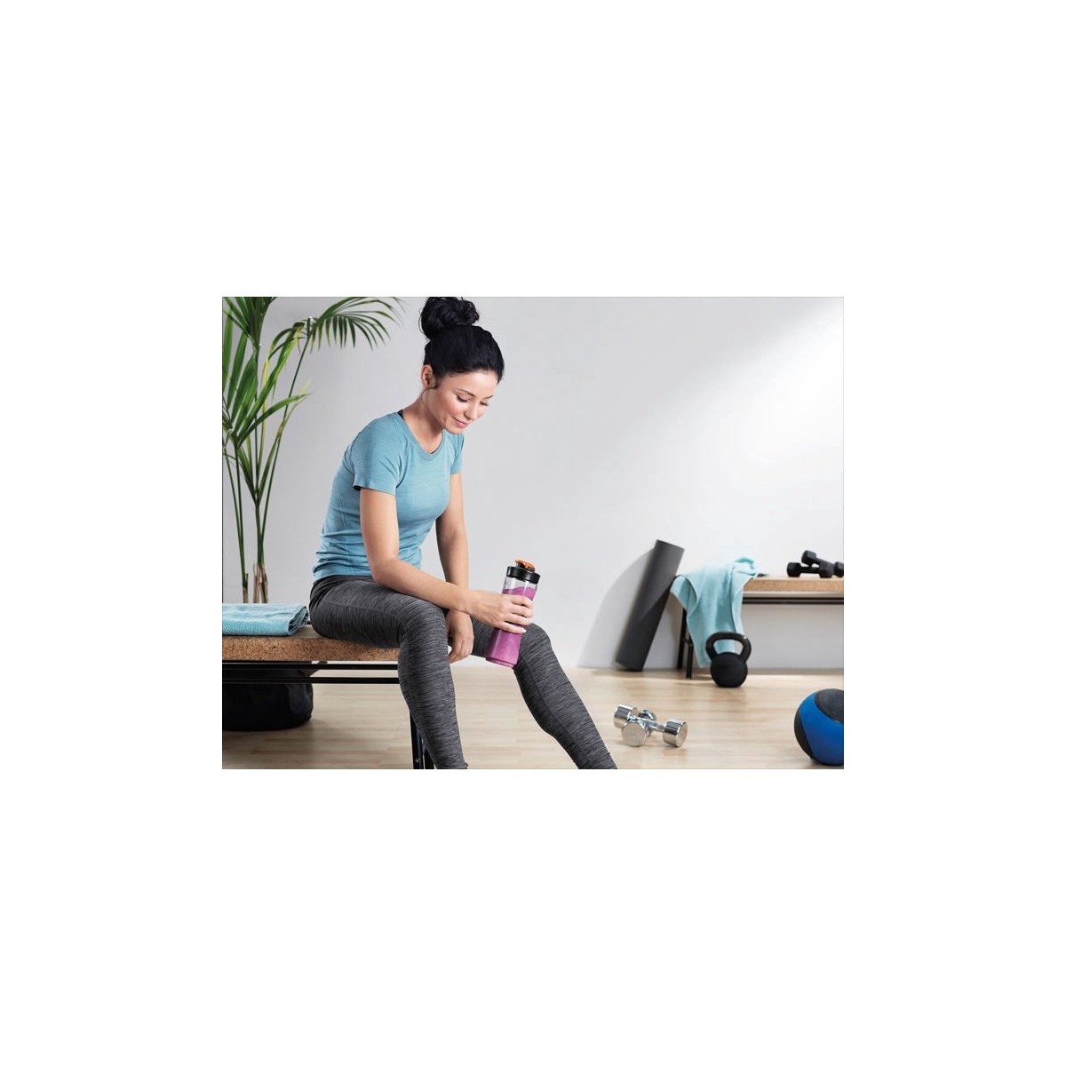 Explorez les différentes possibilités grâce aux accessoires polyvalents: bouteille de 600 ml avec capsule de refroidissement et couvercle avec poignée de transport, 2 bouteilles de 300 ml avec couvercle avec poignée de transport, mini-hachoir, moulin à café.