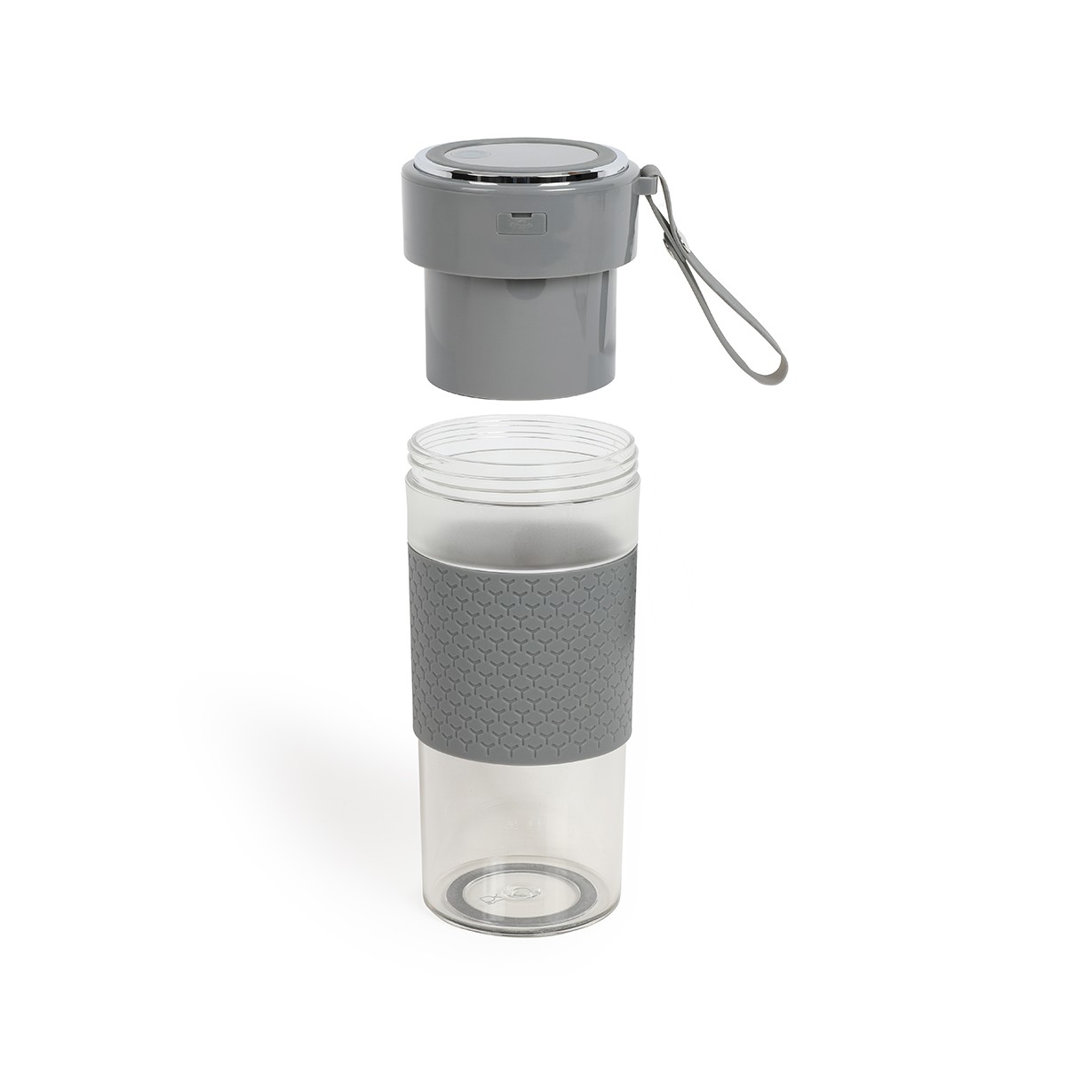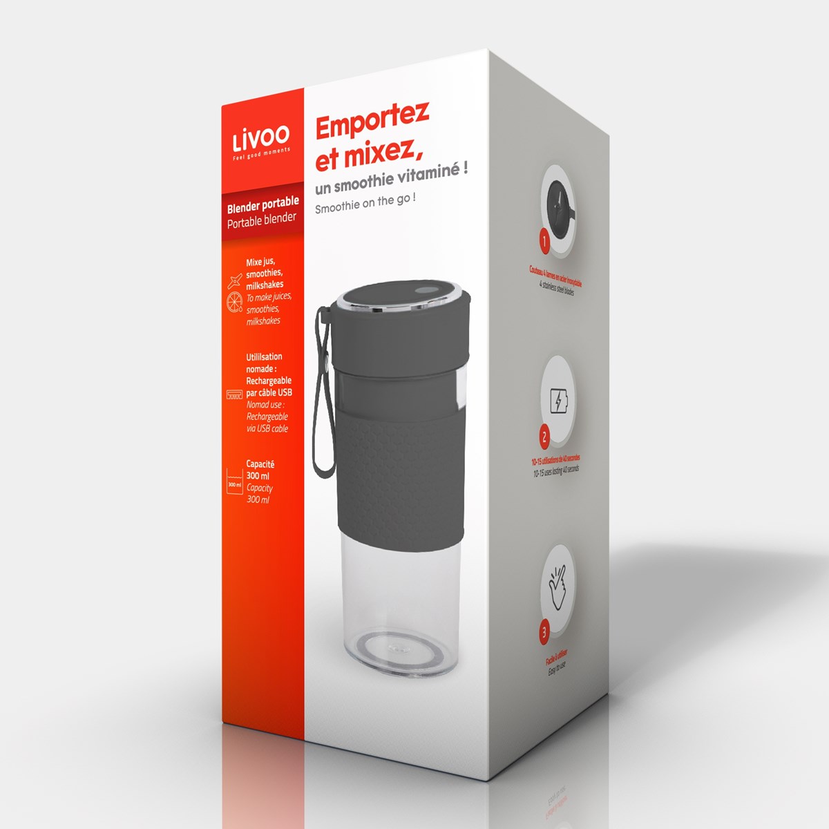 Capacité 300 ml. Puissance 45 W. Couteau 4 lames en acier inoxydable. Contenant en plastique Tritan®️ très robuste. Permet de mixer des aliments pour préparer jus, smoothie, milkshakes. Batterie 1400 mAh rechargeable. Câble de chargement micro USB inclus