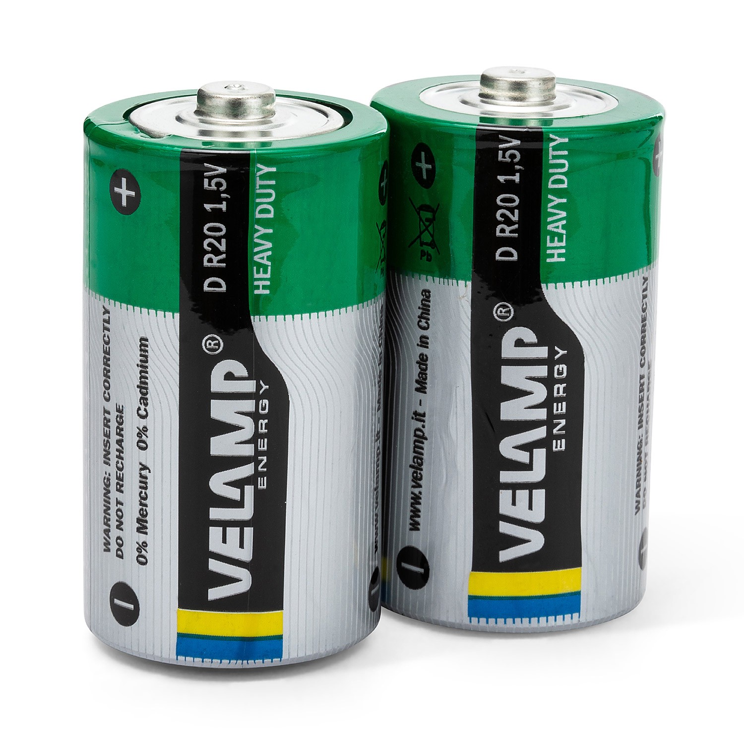 Blister de 2 piles R20 (D), longue autonomie. Qualité comparable aux grandes marques. Idéales pour torches, radios, jouets. Technologie: carbone zinc; idéale pour une utilisation régulière et à très basse tension.