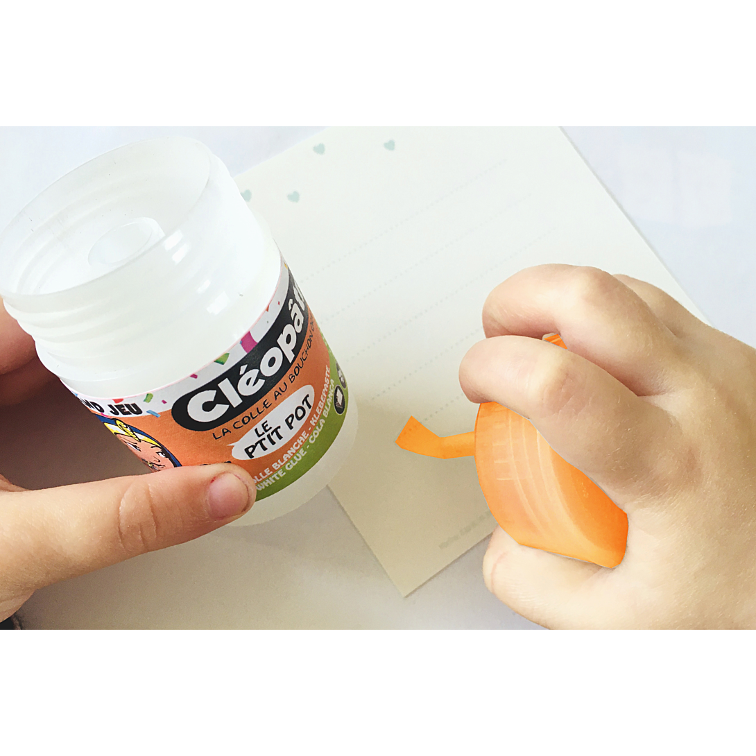 Petit pots de colle Cléopâtre à l'odeur d'amande. Pot de 23 grammes de colle en pâte avec spatule intégrée au bouchon.