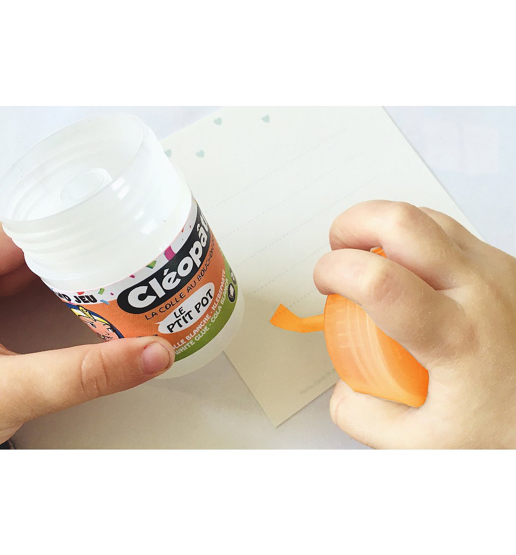 Petit pots de colle Cléopâtre à l'odeur d'amande. Pot de 23 grammes de colle en pâte avec spatule intégrée au bouchon.