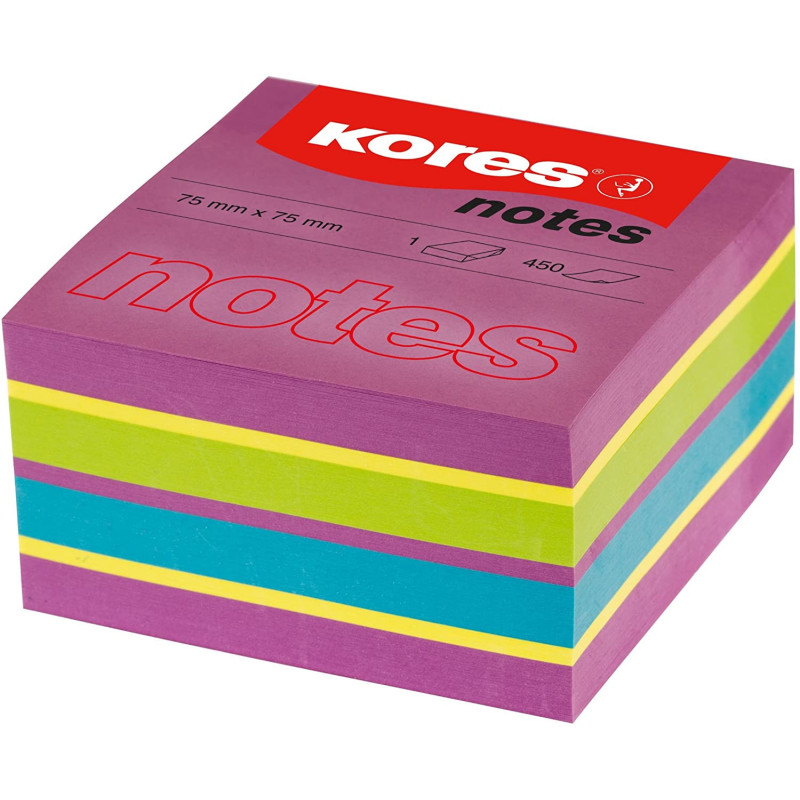 Le bloc Kores contient un assortiment de feuilles fluo (violet, jaune fluo, vert fluo, bleu fluo). Les notes sont carrées et mesurent 7,5 x 7,5 cm.
