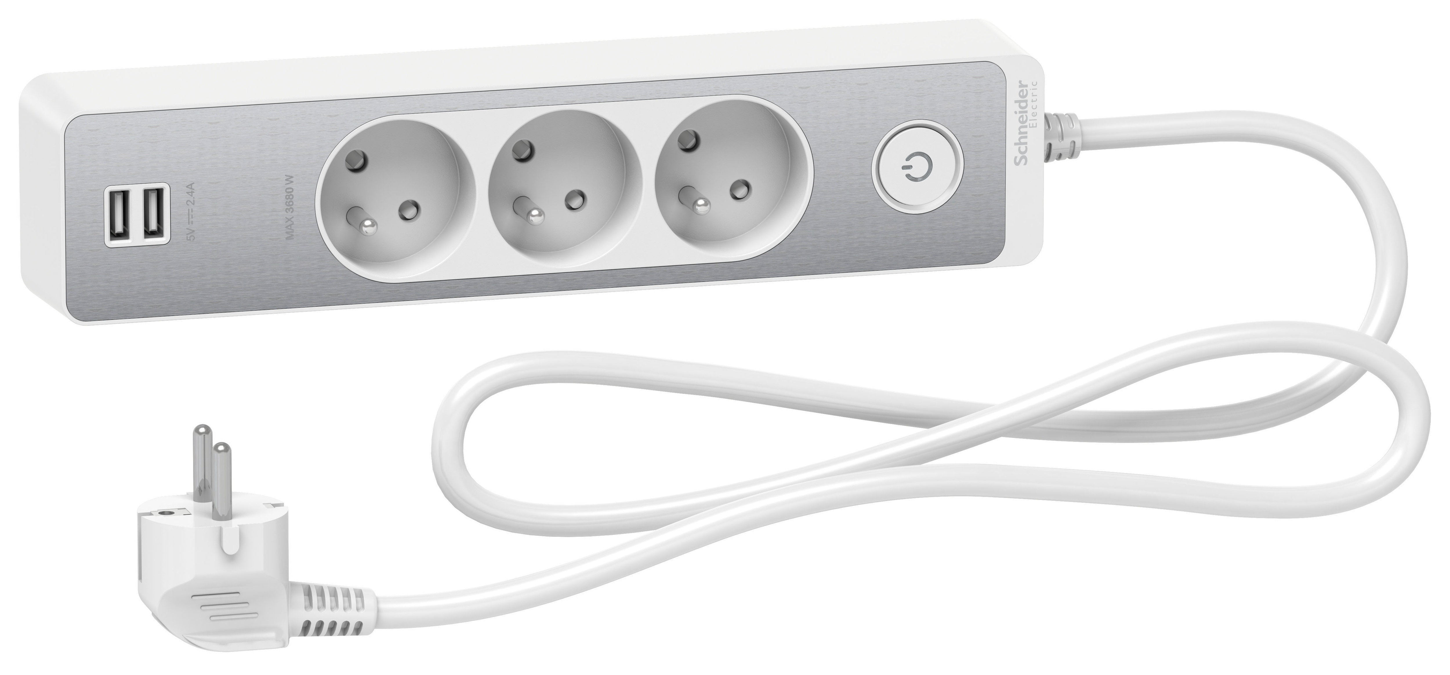 Libellé Bloc multiprise 3 prises 2P+T + 2 USB - Blanc et alu - Schneider
