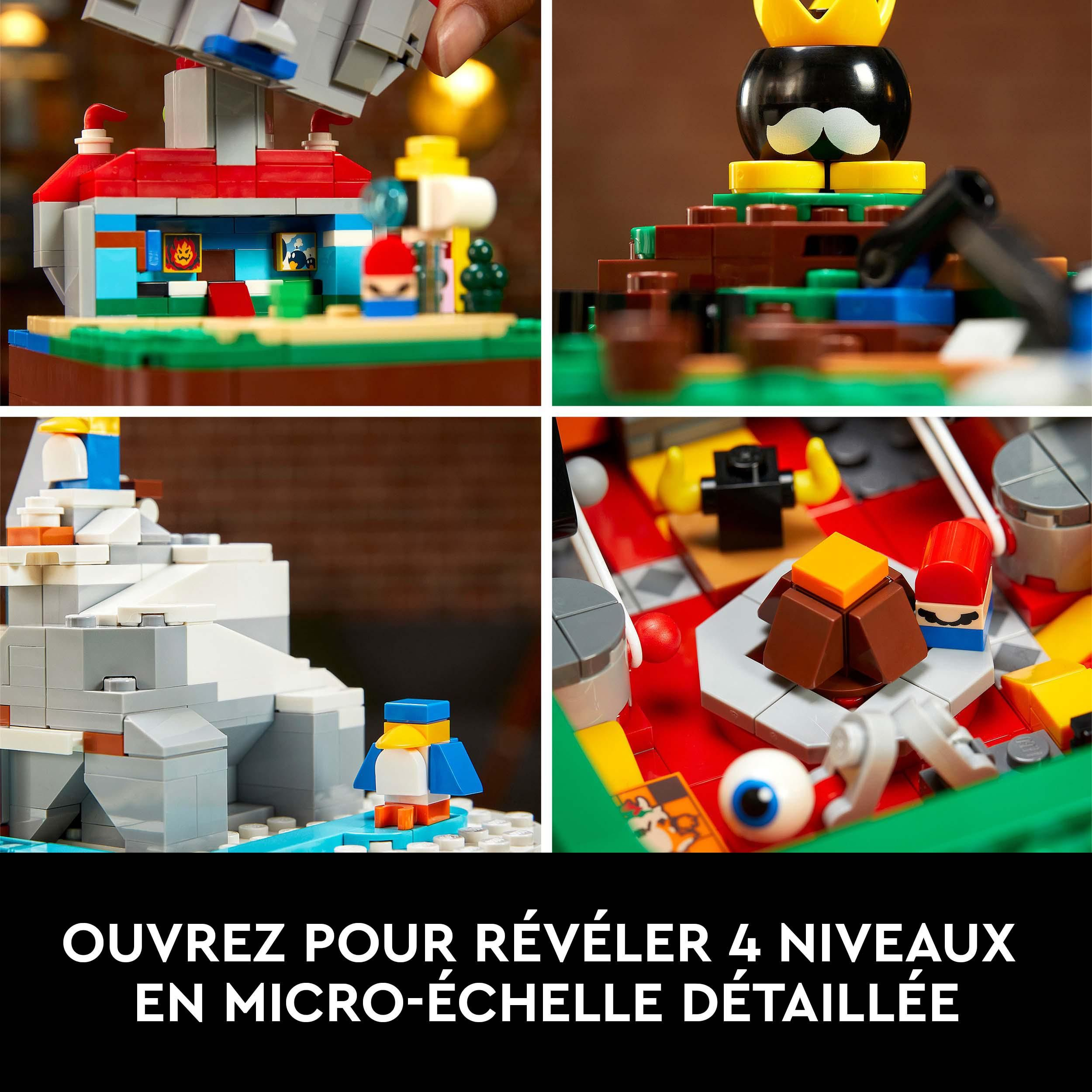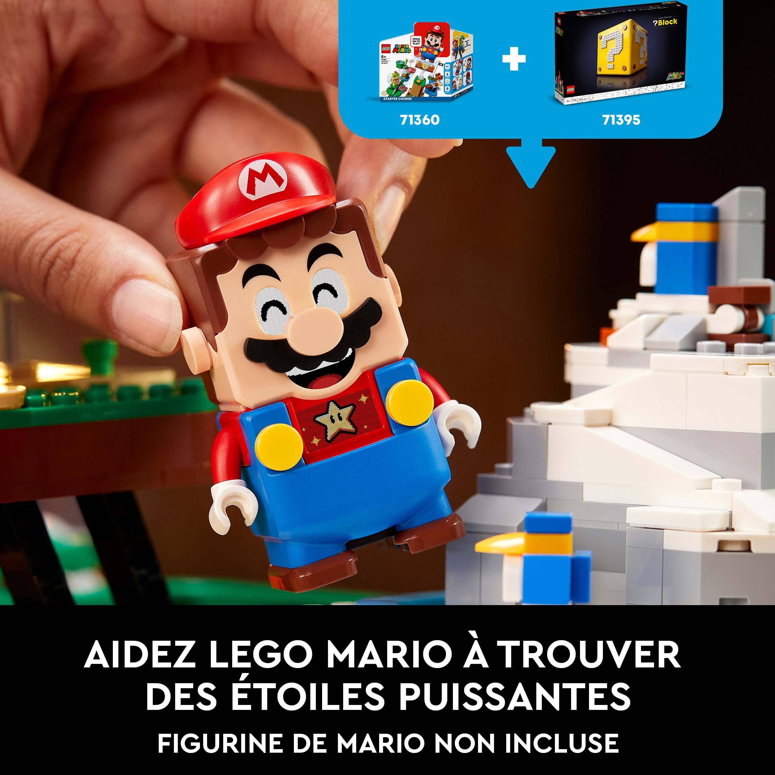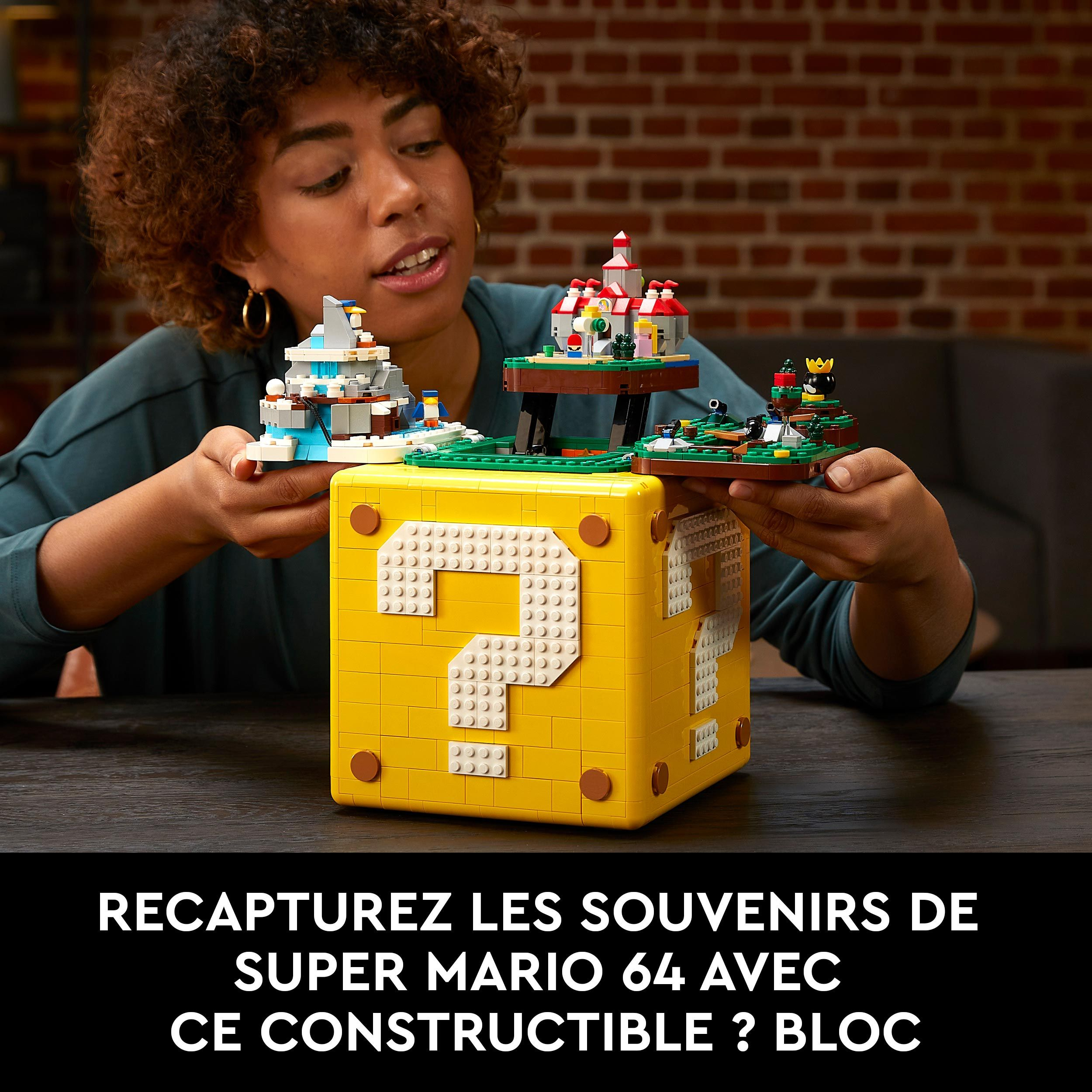 Revivez de beaux souvenirs en construisant, exposant et jouant avec le Bloc « ? » Super Mario 64™ LEGO® (71395). 25 ans après le lancement du jeu vidéo Super Mario 64, ce set inclut un bloc « ? » en briques qui s’ouvre pour révéler des niveaux du jeu instantanément reconnaissables : le Château de Peach, la Bataille de Bob-omb, la Montagne Gla-Gla et les Laves fatales. 10 microfigurines de personnages mythiques animent ces scènes détaillées. Jeu interactif Fabuleux cadeau pour tout fan de Super Mario, ce set s’accompagne d’instructions pas à pas. Pour le jeu interactif, ajoutez un personnage LEGO® Mario™ ou LEGO® Luigi™ des Packs de Démarrage 71360/71387 (vendus séparément) et collectez 10 étoiles de puissance pour révéler des réactions secrètes et plus encore. Des possibilités infinies La gamme LEGO Super Mario inclut des Packs de Démarrage, des Ensembles d’extension et des Packs de Puissance avec lesquels les constructeurs peuvent agrandir, transformer et créer des niveaux uniques.