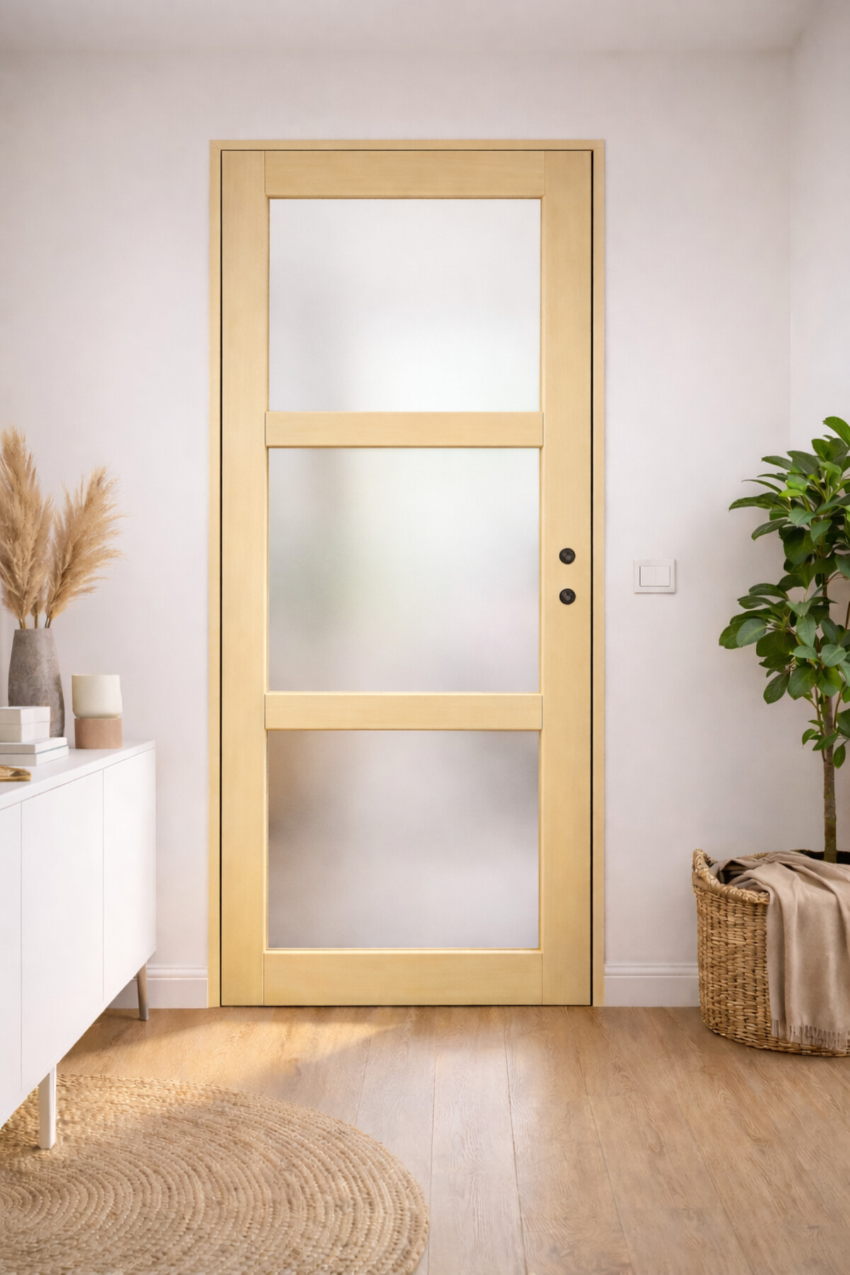 Bloc-porte Ayous Vitrage depoli securite Intimite, lumiere douce et elegance naturelle Le bloc-porte Ayous vitre depoli est une solution elegante pour structurer vos espaces interieurs tout en preservant l'intimite. Realise en MDF avec placage Ayous et fabrique en France, il associe le charme naturel du bois a un design contemporain et apaisant. Avec une dimension cotes tableau de H 204 x L 73 cm et une dimension hors tout de H 210,20 x L 79,5 cm, ce bloc-porte est dote d'un ouvrant de 40 mm d'epaisseur, garantissant robustesse et stabilite. Il est equipe d'un vitrage depoli de securite de 4 mm, permettant une diffusion douce de la lumiere tout en assurant discretion et confort. L'ensemble est monte sur une huisserie de 72 x 45 mm, assurant une installation fiable et durable. Livre pret a poser, le bloc-porte comprend une serrure a cle et une gache posees, ainsi qu'un joint d'isolation isophonique pour un confort acoustique optimal. Sens d'ouverture : poussant gauche Poignee non fournie Conçu exclusivement pour un usage interieur, ce bloc-porte doit imperativement etre installe dans un espace chauffe et isole, afin de garantir sa durabilite et ses performances.