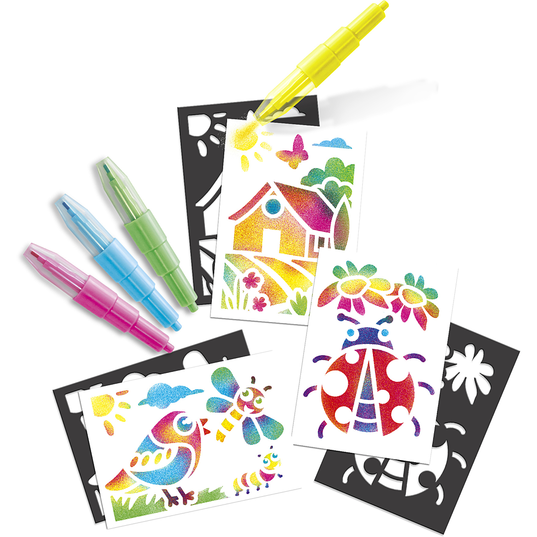 Génial ! Des Mini Blopens faciles à emporter pour dessiner où tu veux ! Crée de superbes dessins à effet aérographe ! Grâce aux 10 pochoirs, tu peux créer plein de dessins super mignons. Les pochoirs sont réutilisables et les bouchons lavables. Dès 4 ans