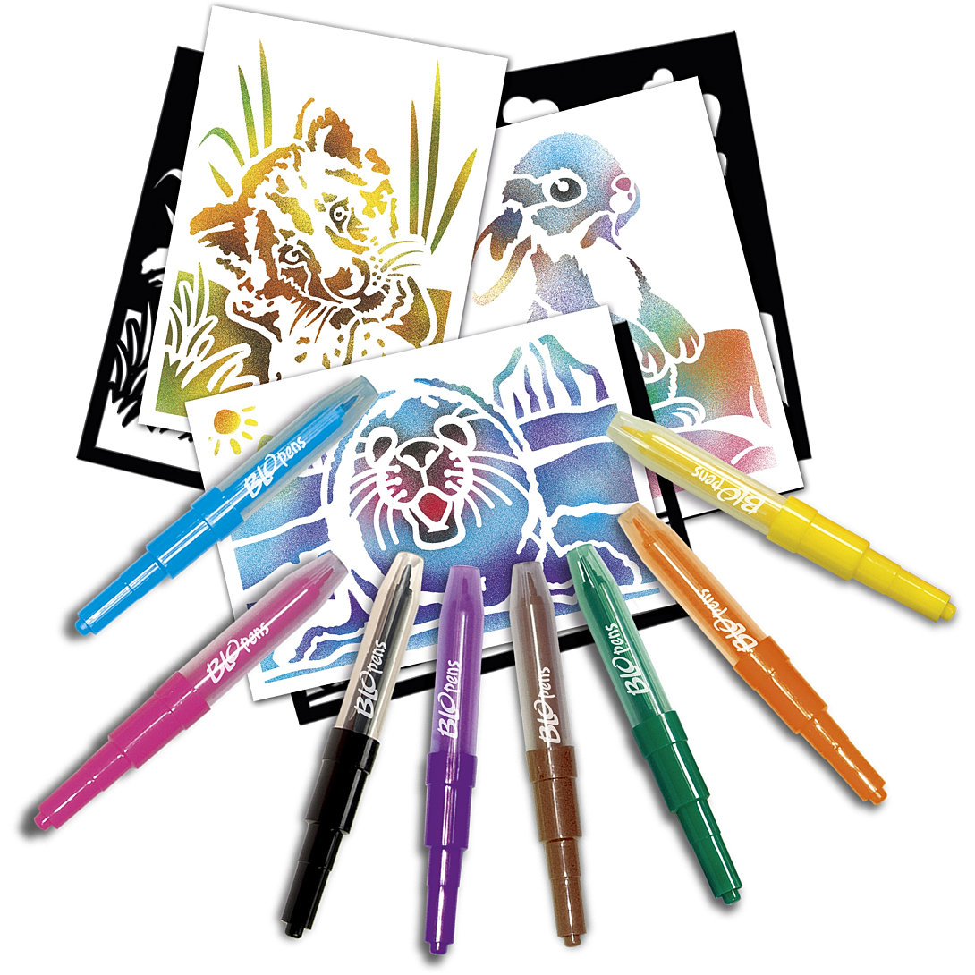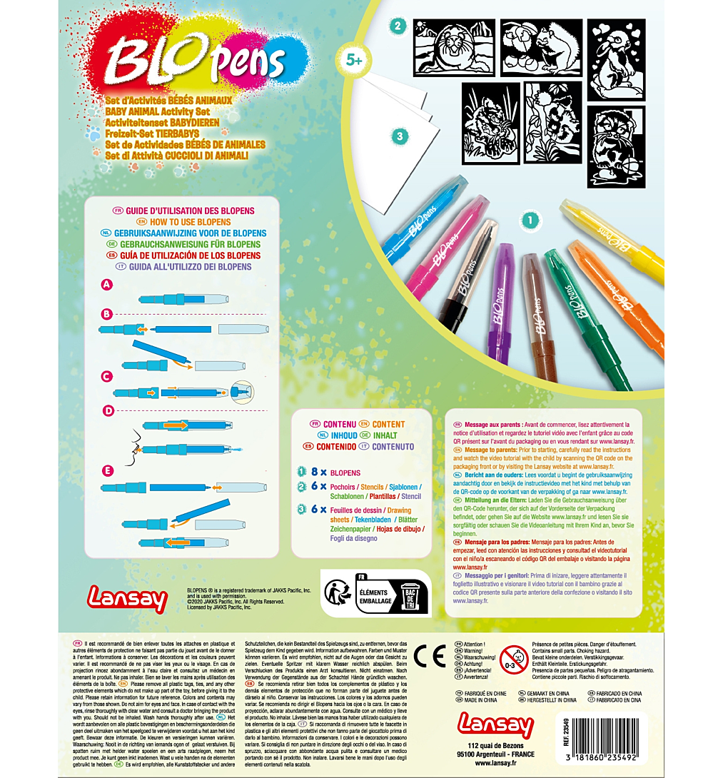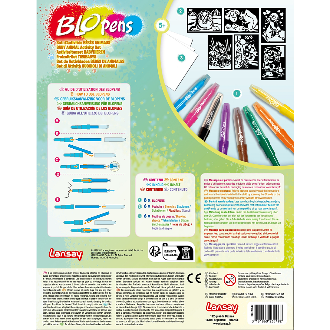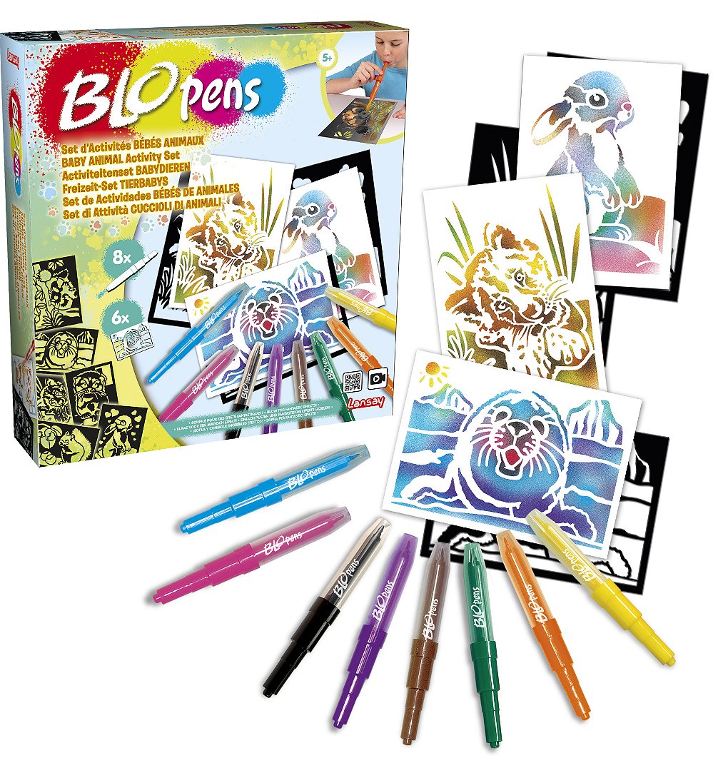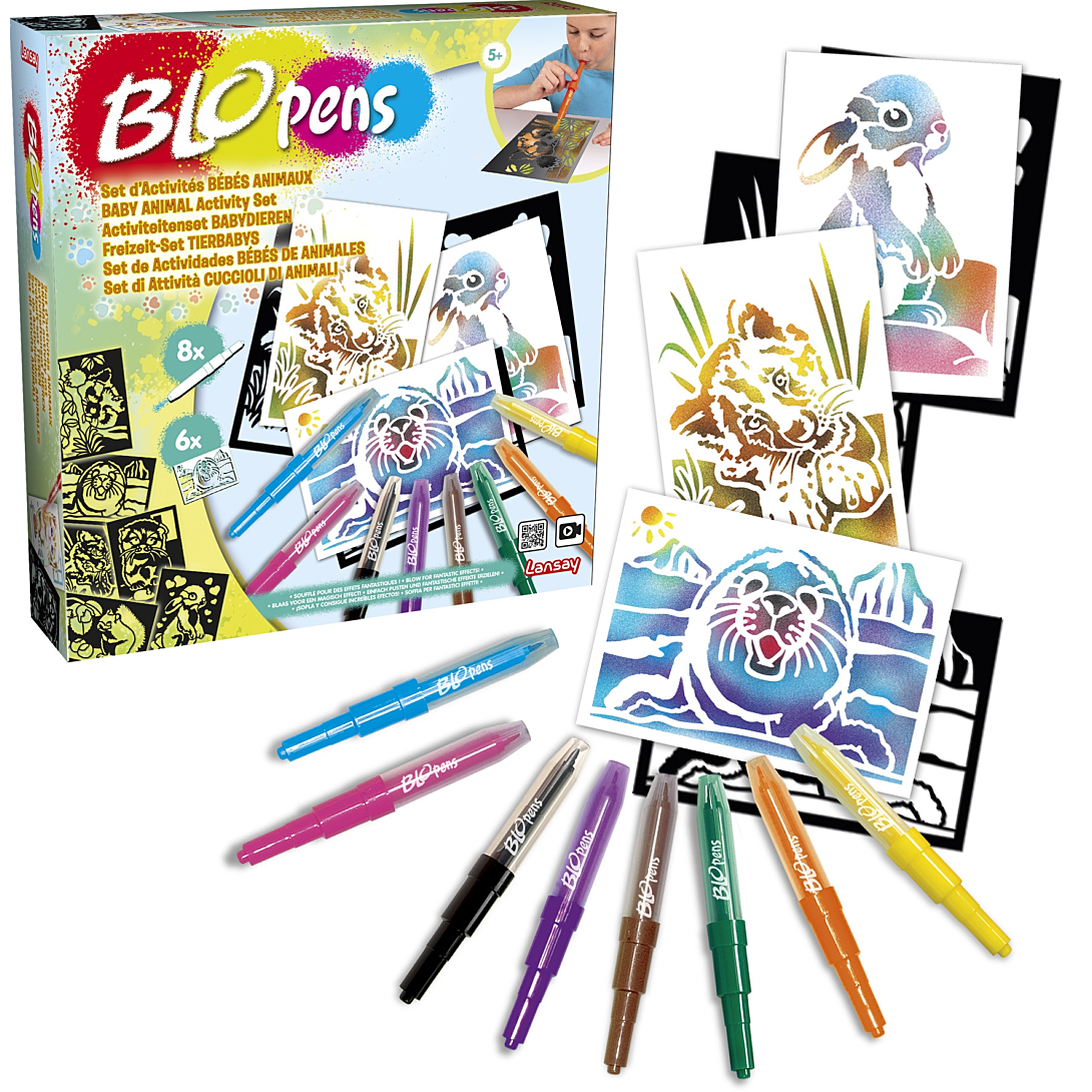 Les Blopens sont des feutres fantastiques ! Utilise un pochoir, souffle dans le stylo et regarde ton dessin apparaître avec un effet aérographe ! Découvre dans ce set des nouveaux pochoirs de bébés animaux trop rigolos et laisse libre cours à ton imagination pour réaliser un lionceau, un lapin, un panda roux et même un phoque des glaciers ! Pochoirs réutilisables. Bouchons lavables.