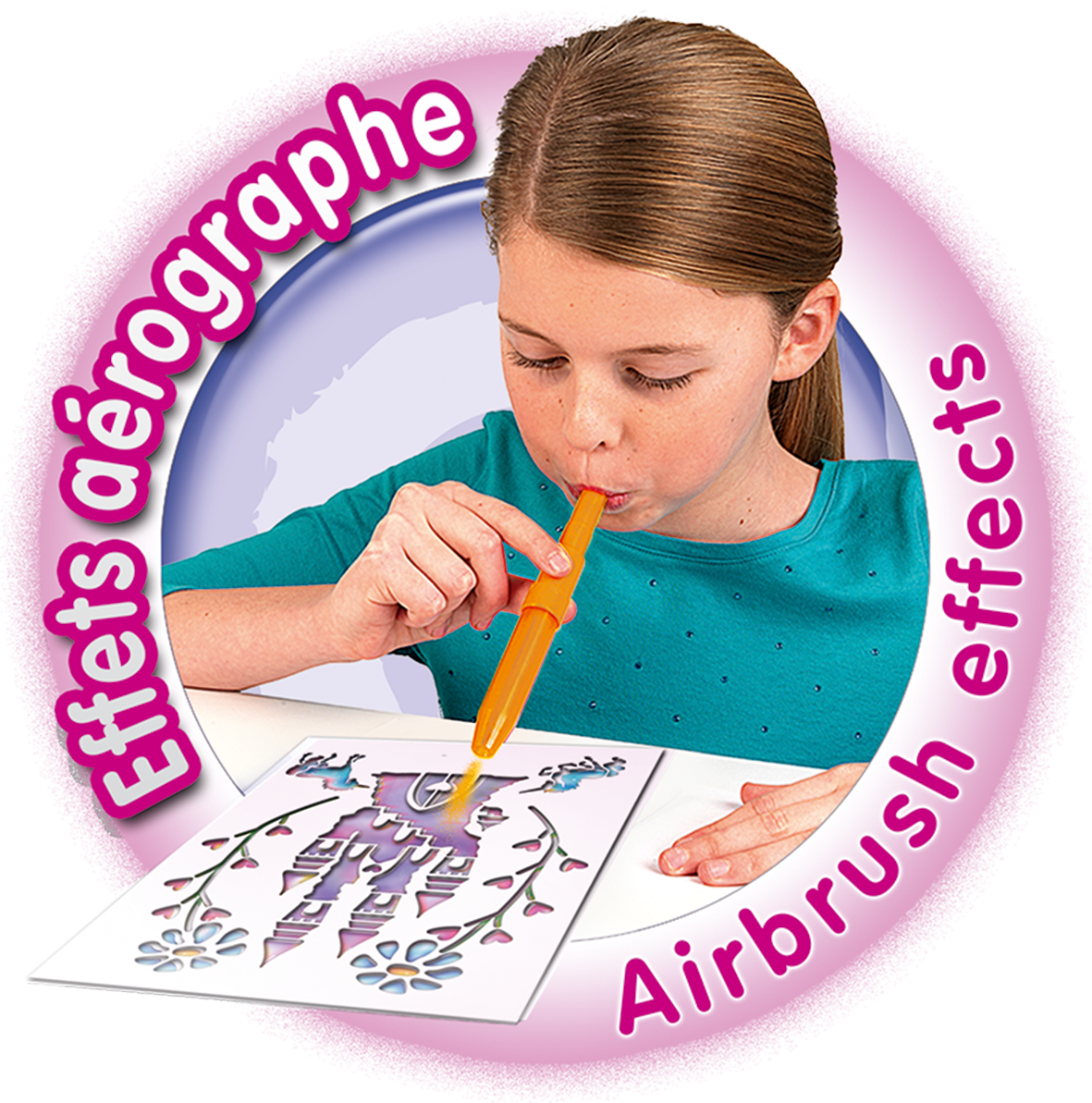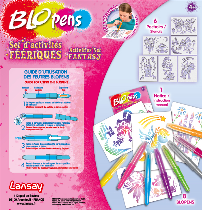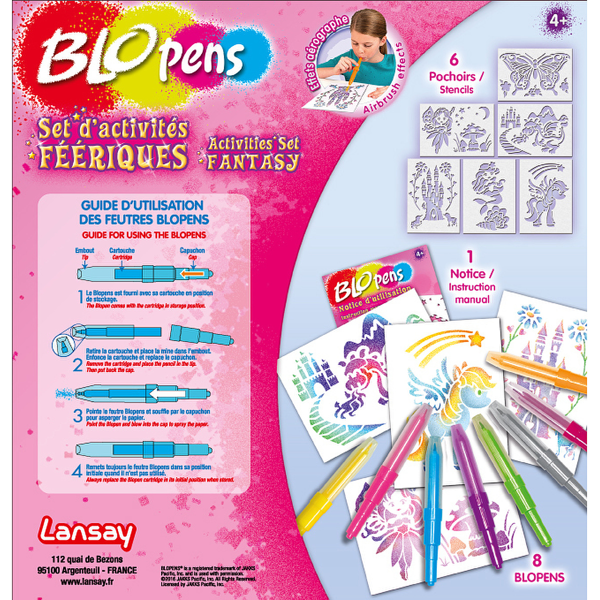 Les Blopens sont des feutres fantastiques ! Utilise un pochoir, souffle dans le stylo et regarde ton dessin apparaître avec un effet aérographe ! Crée des dessins issus de l’univers des contes de fées ! Découvre dans ce set des pochoirs féeriques pour créer des dessins de toutes les couleurs ! Une fée, une sirène, un dragon… Laisse libre cours à ton imagination ! Pochoirs réutilisables. Bouchons lavables.