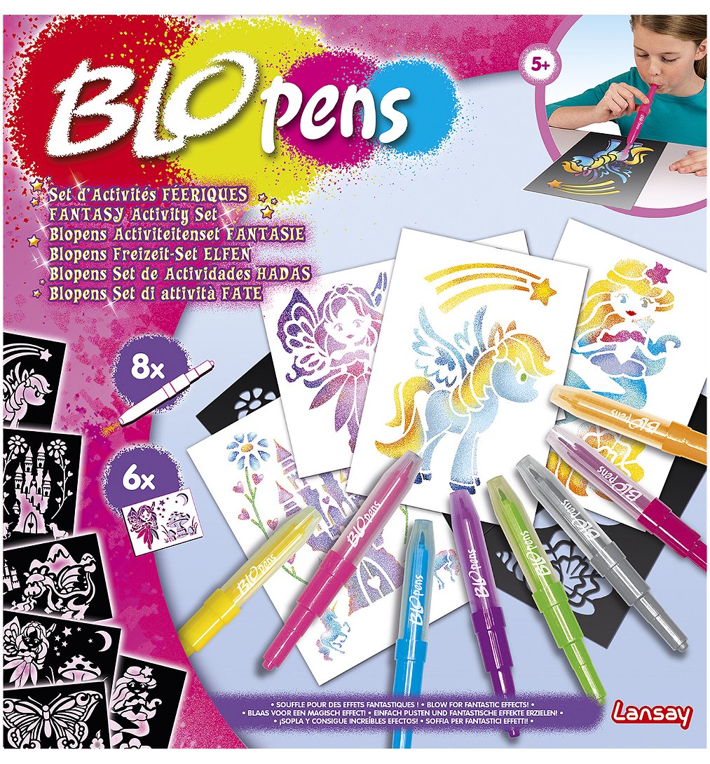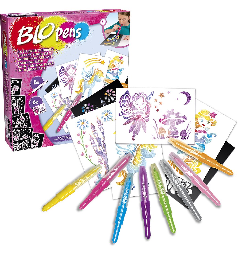 Les Blopens sont des feutres fantastiques ! Utilise un pochoir, souffle dans le stylo et regarde ton dessin apparaître avec un effet aérographe ! Crée des dessins issus de l’univers des contes de fées ! Découvre dans ce set des pochoirs féeriques pour créer des dessins de toutes les couleurs ! Une fée, une sirène, un dragon… Laisse libre cours à ton imagination ! Pochoirs réutilisables. Bouchons lavables.
