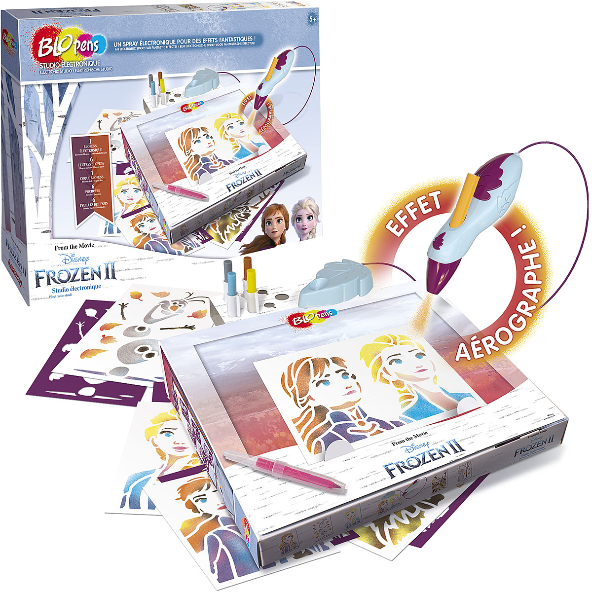 Réalise tes dessins préférés avec effet aérographe avec ce super Blopens Electronique Reine des Neiges II ! Pas besoin de souffler, tu n'as qu'à insérer ton feutre Blopens dans le Blopens Electronique, et tu pourras ainsi dessiner Elsa, Anna et tous ses amis à l'aide des pochoirs prévus à cet effet ! C'est pratique, la boîte Blopens se transforme en pupitre, pour que tu puisses utiliser ton imagination comme une vraie artiste ! Pochoirs réutilisables. Bouchons lavables.