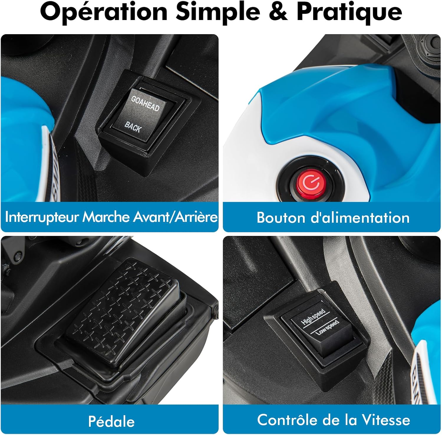 - Cadeau idéal : Notre moto électrique est le cadeau idéal pour les petits coureurs afin de les aider à réaliser leurs rêves tôt et à récolter les fruits d'une enfance inoubliable et heureuse. Les garçons et les filles de 3 à 8 ans peuvent développer leur coordination des mains et des pieds, leur sens de l'orientation en roulant.Description : Une moto d'enfant cool et réaliste pour surprendre les petits coureurs et leur offrir une enfance formidable et heureuse ! Le moto avec roues auxiliaires permet à l'enfant d'explorer les différentes routes plates à une vitesse allant jusqu'à 3 km/h. En outre, l'enfant peut écouter de la musique, se connecter à la prise USB, contrôler le volume, allumer et éteindre les phares et bien plus encore. Une fois chargée, notre trottinette offre à votre enfant environ 40 minutes de temps de conduite amusant.