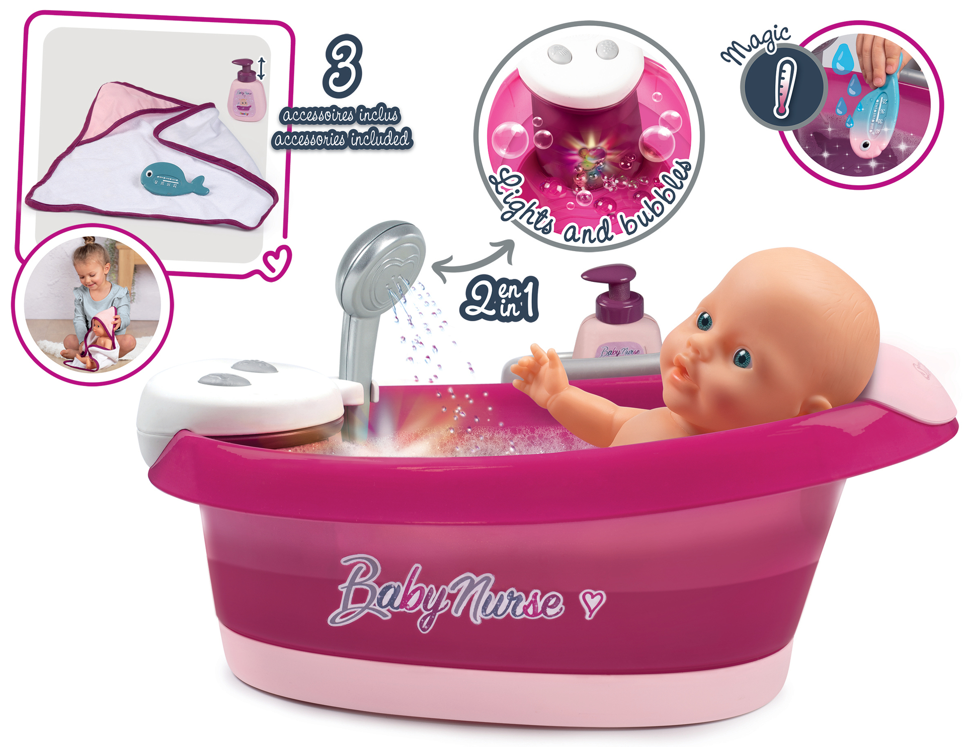 | Plus produit | Baignoire balnéo avec module électronique: jets d\'eau et bulles. Douchette fonctionnelle. Lumières LED. Accessoires inclus: cape de bain, pousse-mousse, thermomètre thermosensible. |