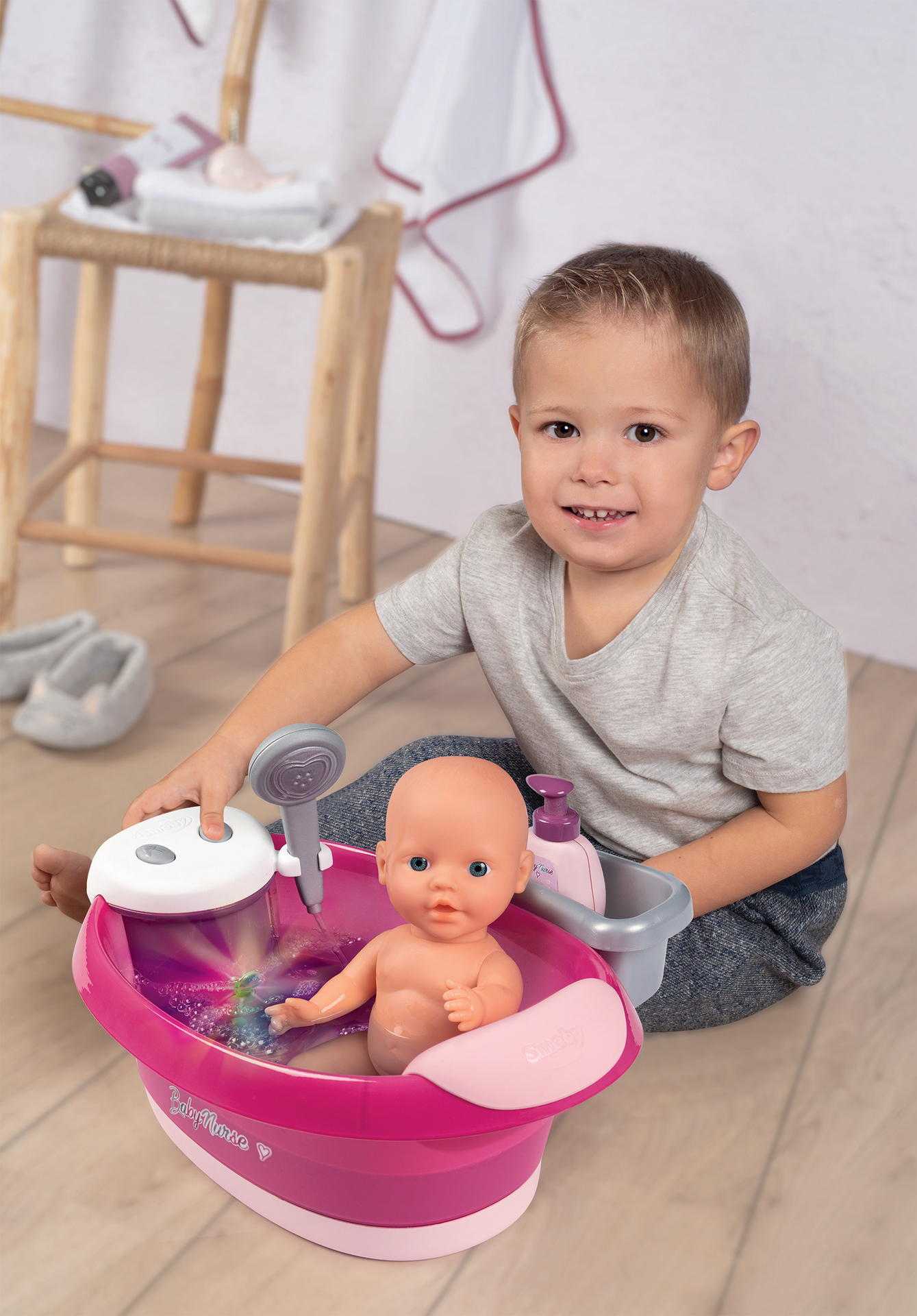 Elle dispose d'un bac de rangement, d'un repose-tête, d'une douchette fonctionnelle (circuit fermé) et de divers accessoires : cape de bain matière éponge, pousse-mousse gel douche avec action mécanique, thermomètre baleine thermosensible (il change de couleur et devient violet au contact de l'eau).