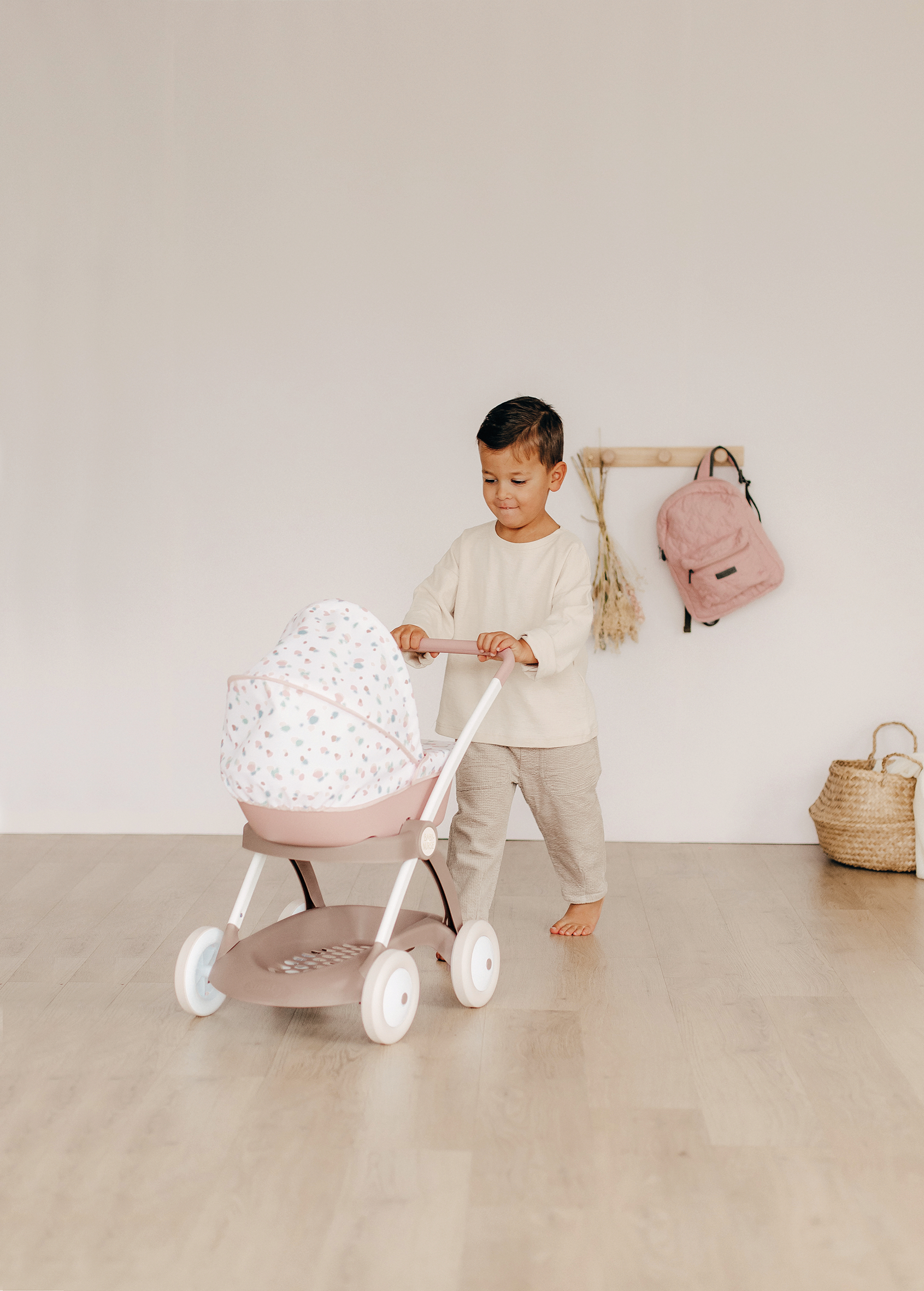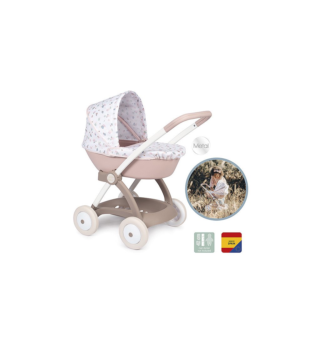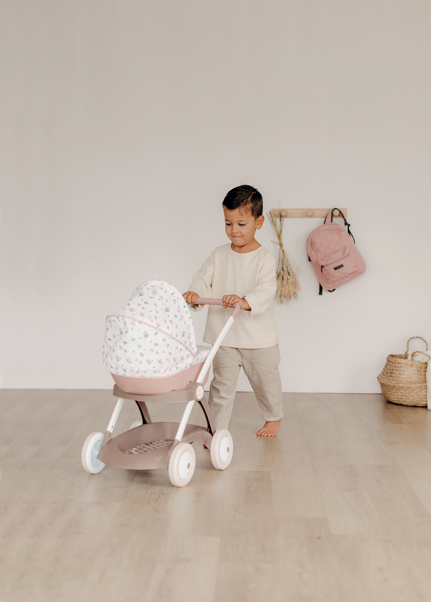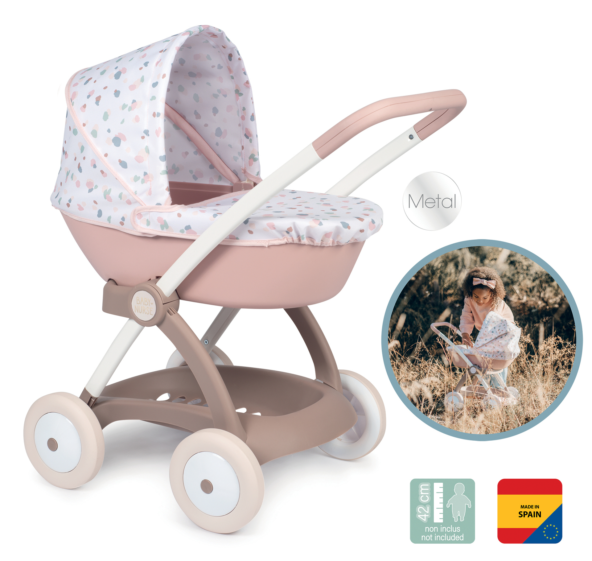 Plus produit Landau pour poupon jusqu\'à 42cm avec capote rabattable. Nacelle amovible. Grand panier de rangement. Structure métal et plastique. Hauteur poignée : 58cm. Poupon non inclus.
