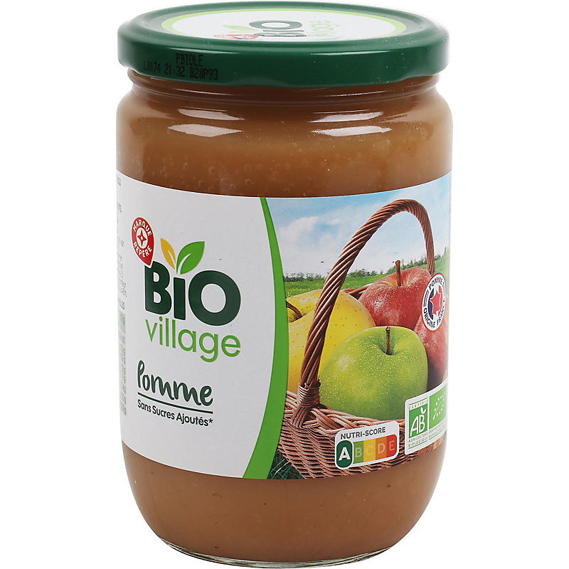 Purée de pommes sans sucres ajoutés* - Produit issu de l'agriculture biologique. *Contient des sucres naturellement présents, conformément à la réglementation des purées de fruits. BIO VILLAGE