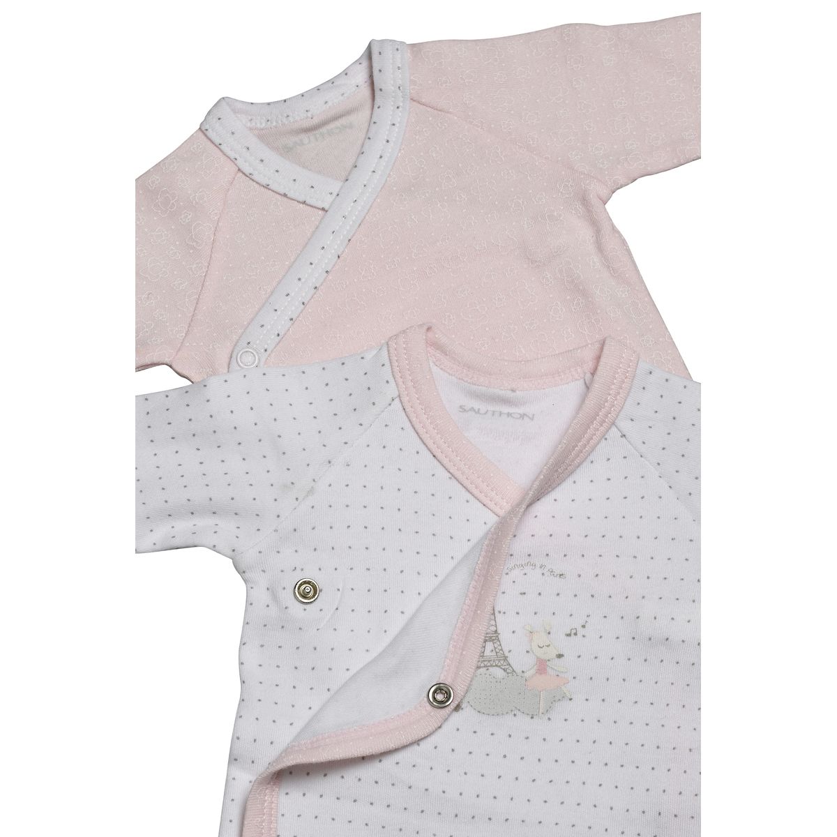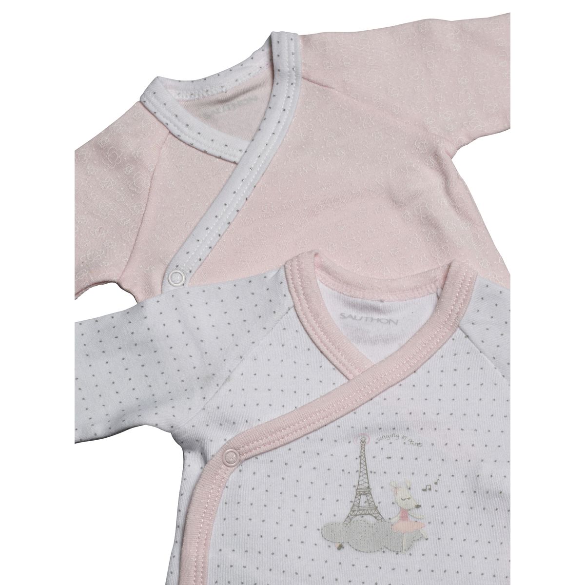Lot de deux bodies à forme croisée, en jersey de coton. Le lot se compose de deux bodies imprimés all-over: un body à pois gris et colletage contrasté rose; et un body imprimé all-over rose avec colletage contrasté blanc. Une délicate sérigraphie Lilibelle au pied de la tour Eiffel est imprimée sur le body blanc.